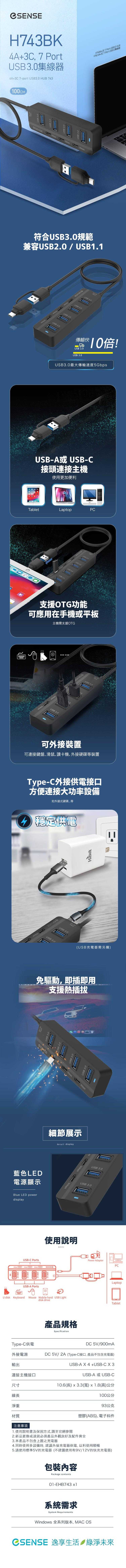 USB供電:DC 5V/900mA 外接電源: DC 5V/ 2A(type-C接口,產品不包含充電器) 輸出: USB-A X 4 +USB-C X 3 連接主機接口: USB-A 或 USB-C 尺寸: 長10.6 * 寬3.3 * 高1.8公分 線長:100公分 材質:塑膠(ABS)、電子料件 支援系統:MAC OS, Windows |