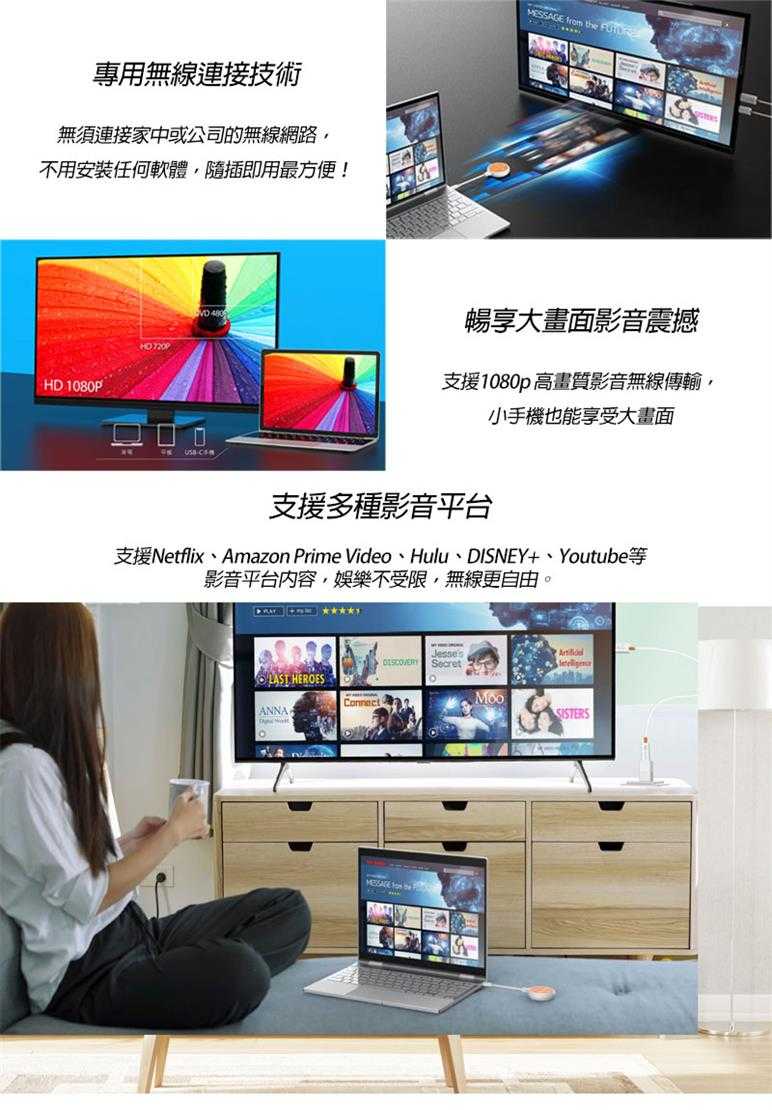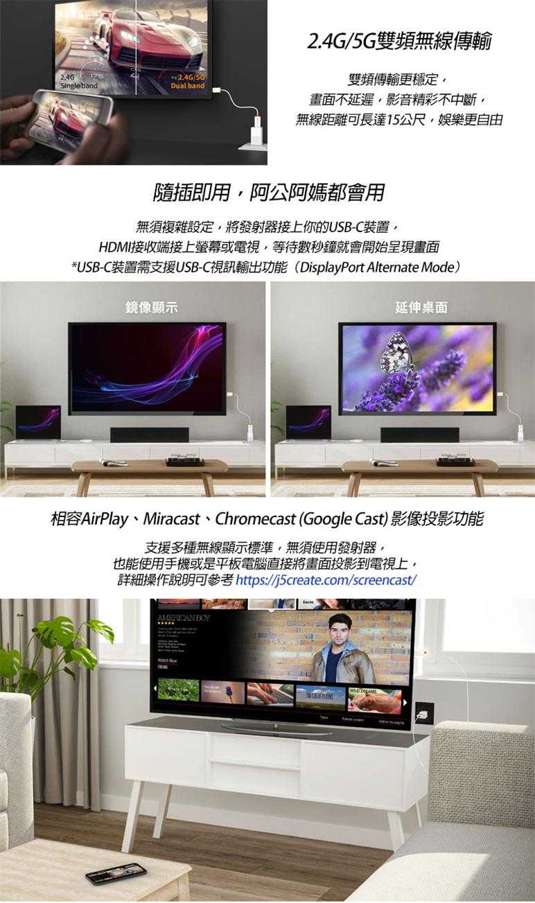 頻段:IEEE 802.11ac(2.4G+5G)雙頻段 距離:約10-15公尺 無線網路加密方式:WPA2 Channel Width:20MHz / 40MHz 支援協議:HDMI™ v1.3 & HDCP1.4