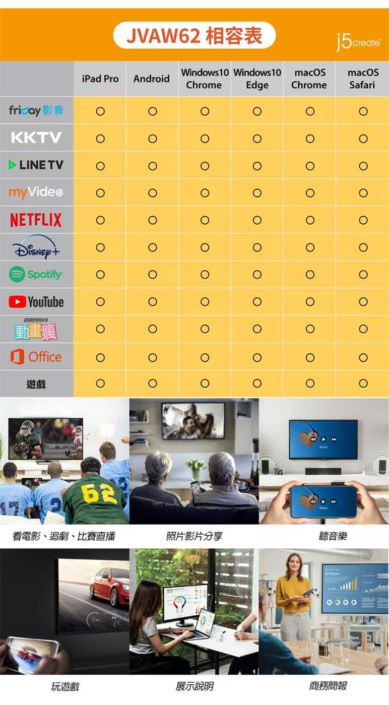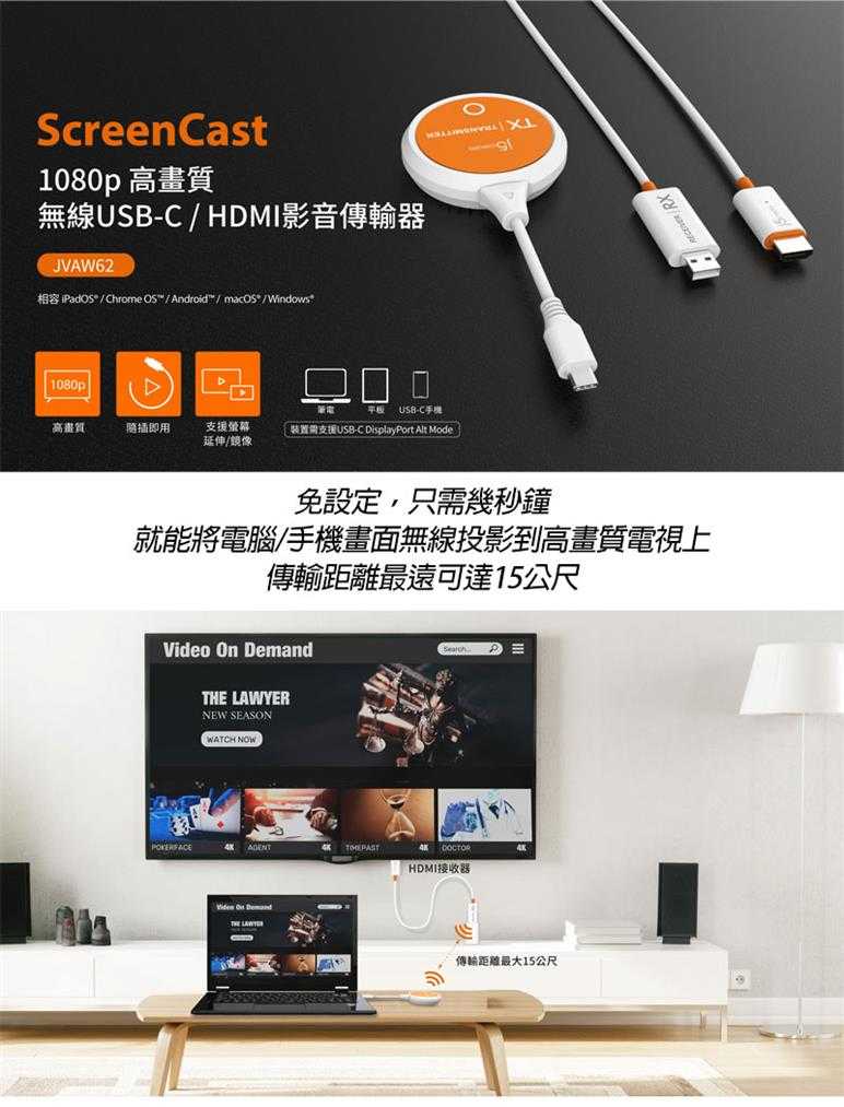 JVAW62無線影音傳輸器可將筆電、平板或手機上的畫面訊息無線發送至大螢幕,隨插即用並支援多種無線標準,透過簡單的設定輕鬆升級大畫面,廣泛兼容Windows®,Android™,macOS®和iPadOS®,外觀設計輕巧,方便隨身攜帶,非常適合各種娛樂、商務場合或旅行使用。