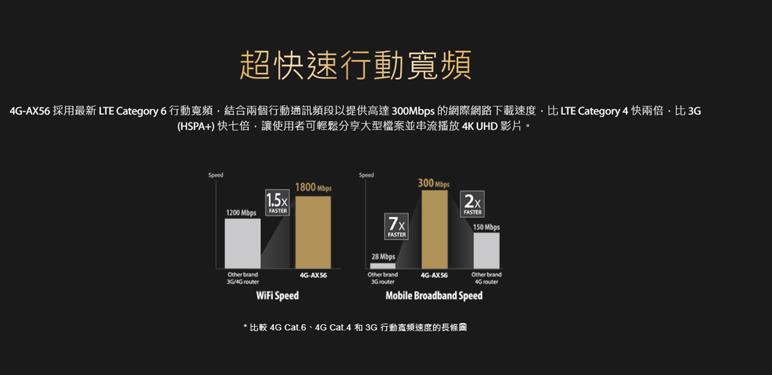 - 極致的 4G 速度 – 4G LTE Category 6 技術可讓您享受比 3G 行動寬頻快 7 倍的速度。