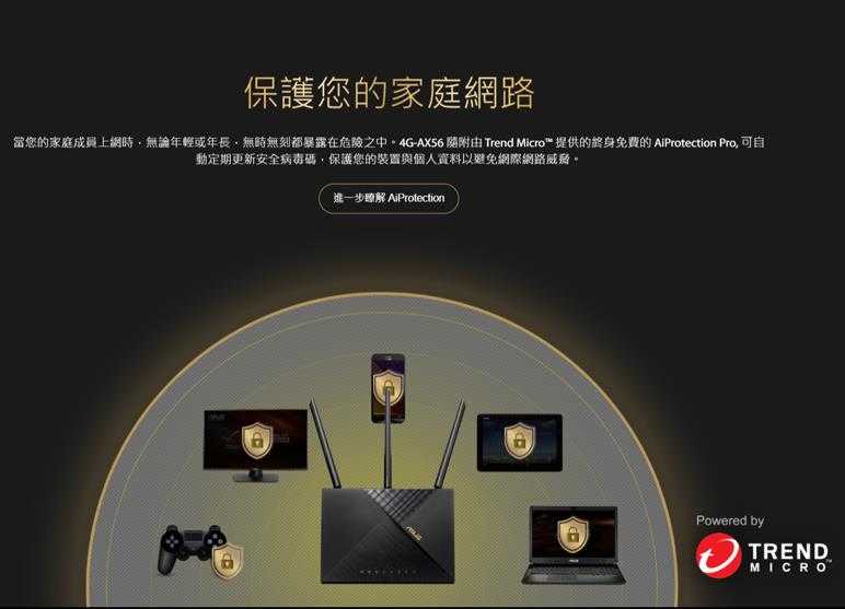 - 保護您的家庭網路 – 由 Trend Micro™ 提供終身免費的 AiProtection,可為您所有的連網智慧裝置阻擋網際網路的安全威脅。