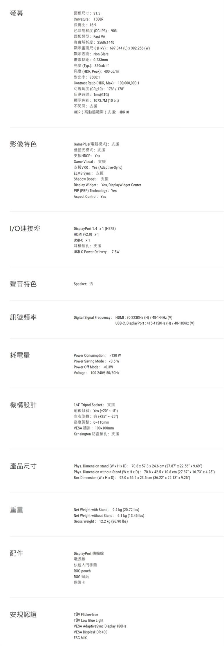 ● 面板尺寸:31.5吋 Fast VA面板 1500R
