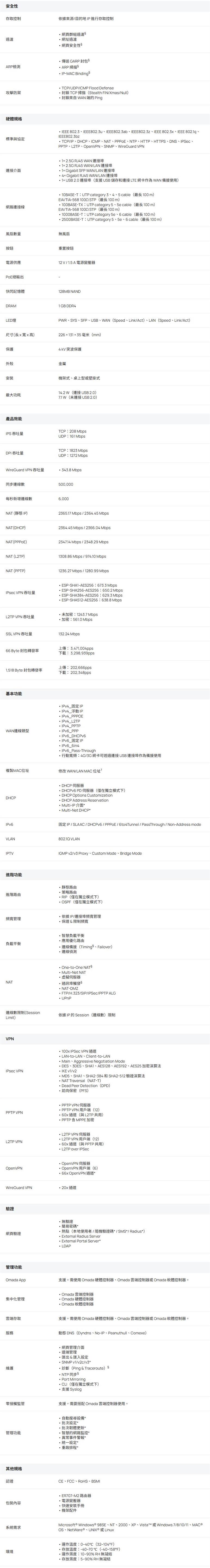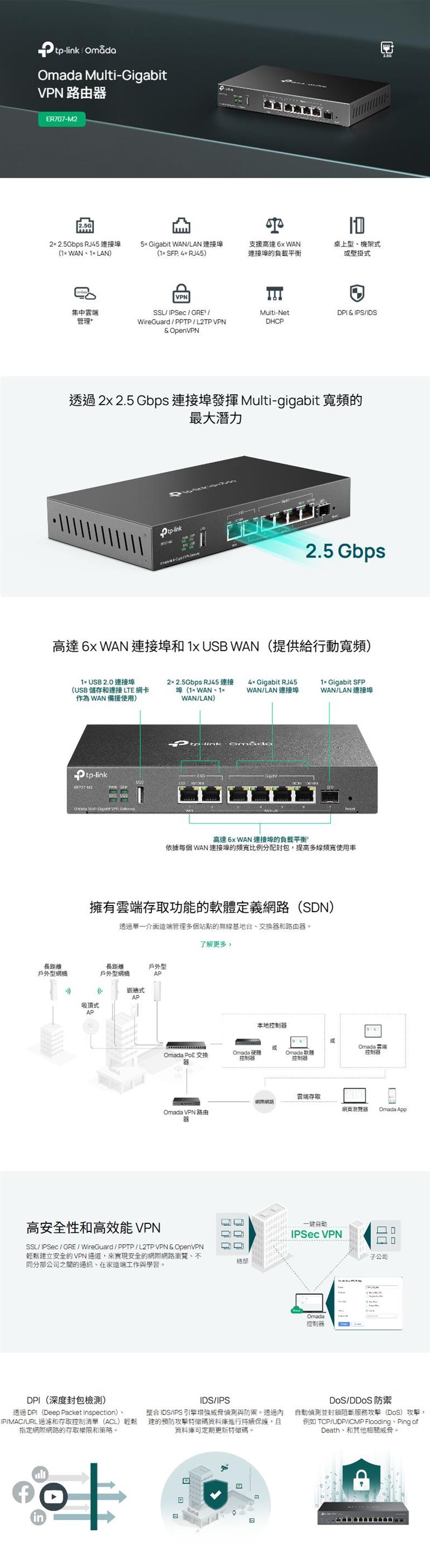 ●DoS/DDoS 防禦、IP/MAC/URL 過濾、DPI 和 IPS/IDS 可增加安全性