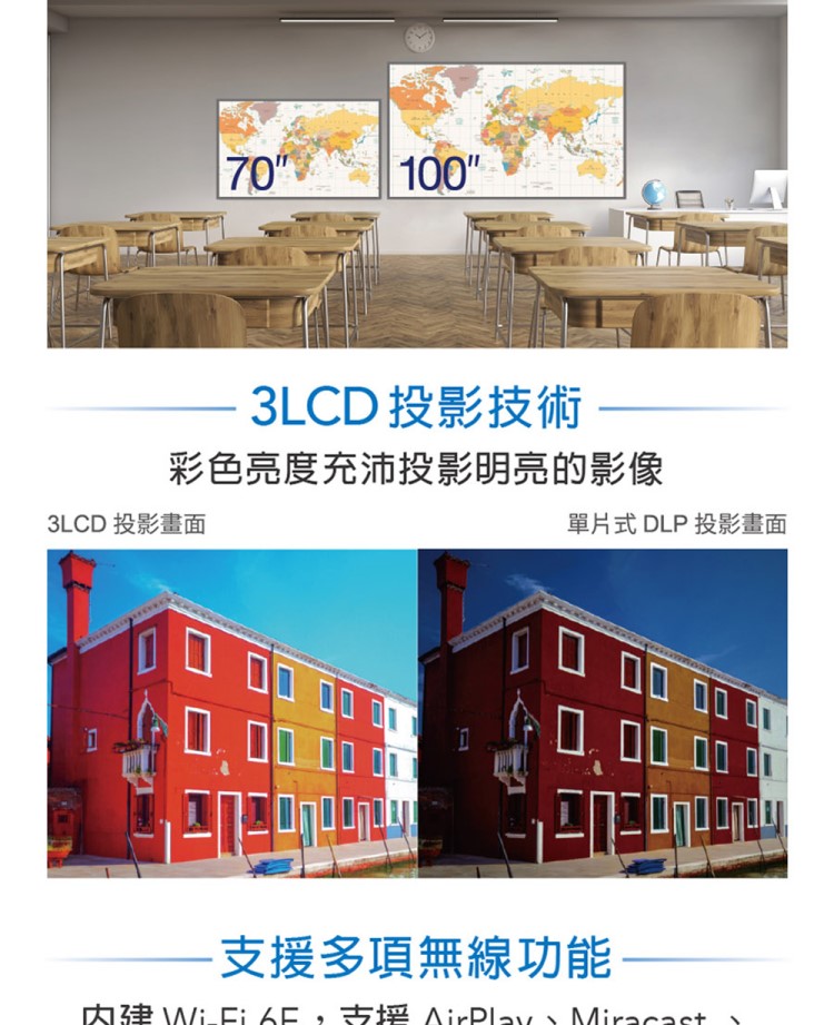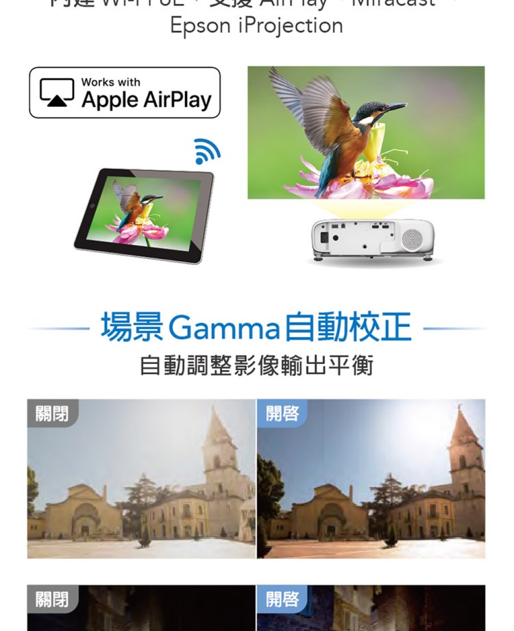 .支援AirPlay、Miracast,亦可搭配Epson iProjection應用程式,可同時分享並控制多達四個連線裝置