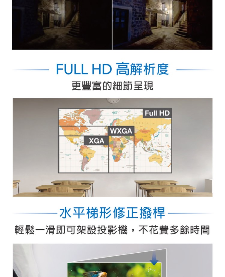 .配備場景Gamma自動校正,自動±30度垂直,手動±30度水平梯形修正;支援自動開機