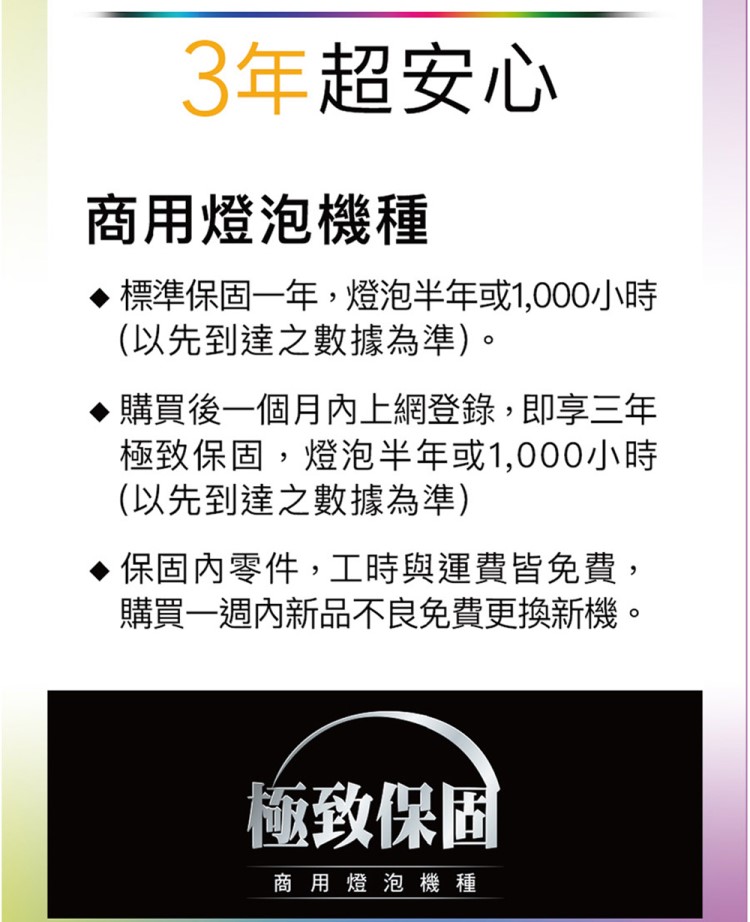 Epson極致保固:購買後一個月內進行上網登錄即享主機三年極致保固,含工時與零件(不含耗材),燈泡享半年或一千小時,讓您放心享受高畫質!