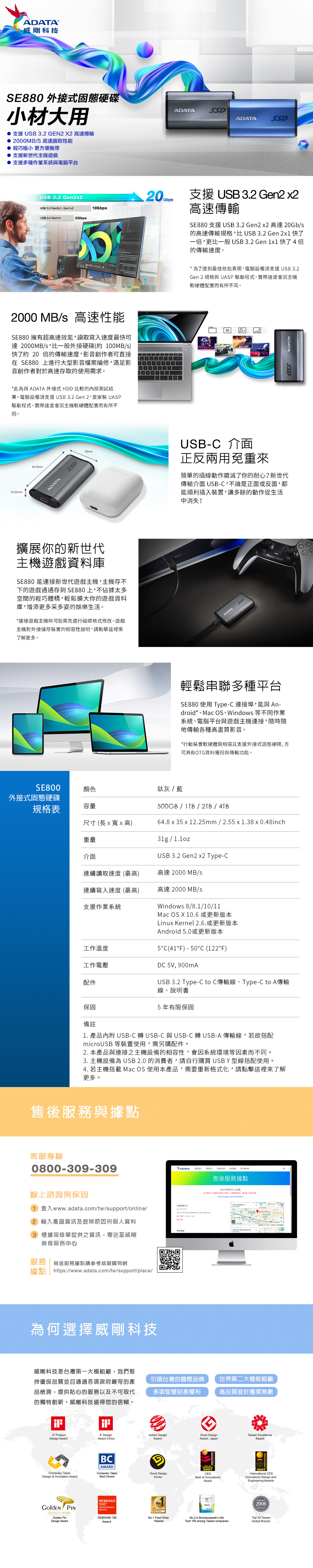 | 介面 | USB 3.2 Gen2 x2 Type-C (USB 20Gbps) |