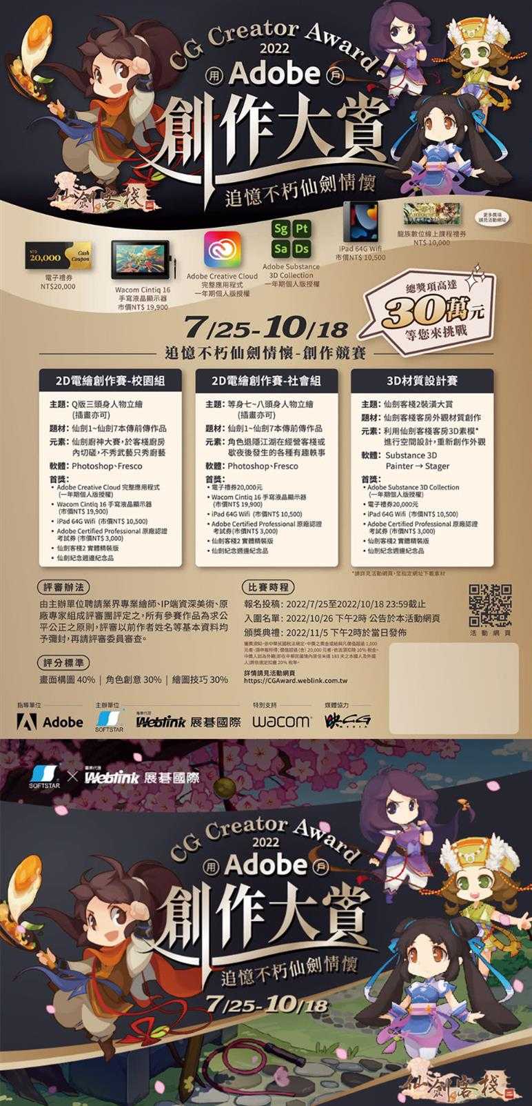 以知名經典IP仙劍奇俠傳系列延伸遊戲《仙劍客棧2》為主題,邀請各路 Adobe 使用者、3D 創意用戶、數位繪圖好手踴躍參加,總獎項高達 30 萬元,等您來挑戰!