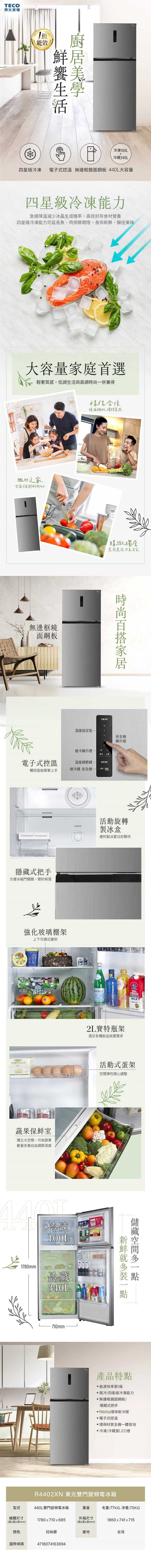 總 容 量:440L (冷藏340L、冷凍100L)
