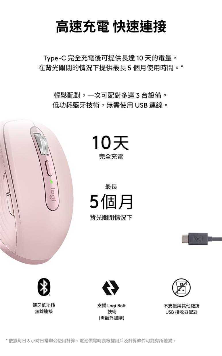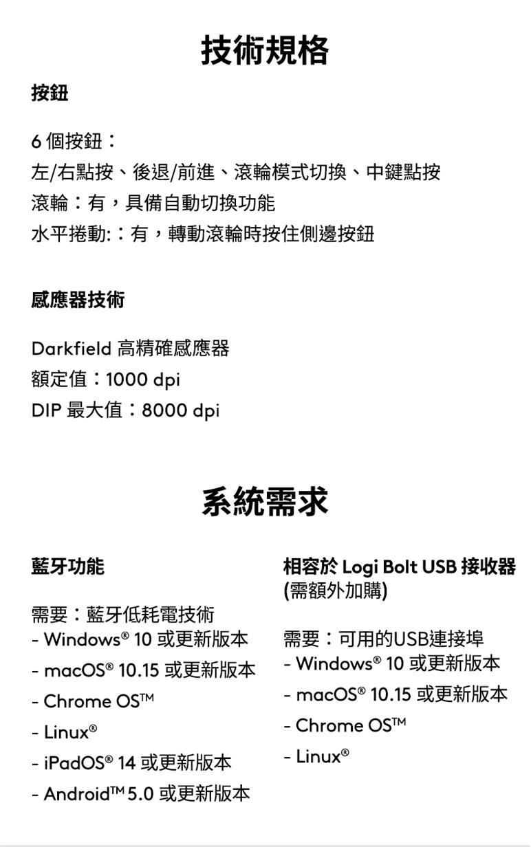 ● 藍牙與2.4G無線 Bolt接收器相容(未隨附接收器)
