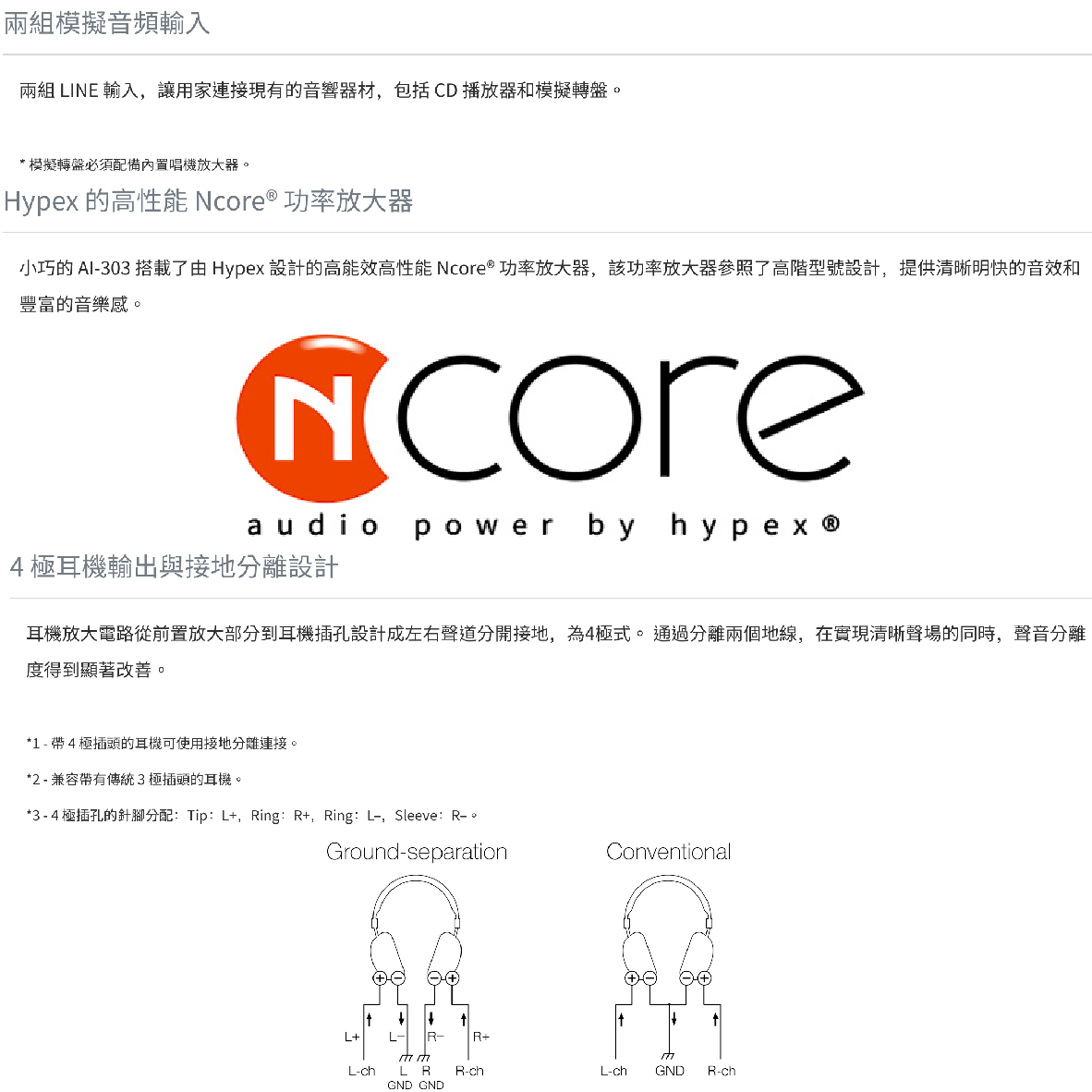AI-303 體積小巧,易於放置在電視周圍,作為 USB DAC,支持 11.2MHz DSD 和 PCM 384kHz/32bit 高分辨率 (HD) 音源,適合不同的家居影音系統和桌面音響配置,AI-303 新增了 USB-C 插口連接手機和平板,可以透過串流方式欣賞音樂同時,也能夠利用 AI-303 內置的高階解碼器提升大幅度音質。