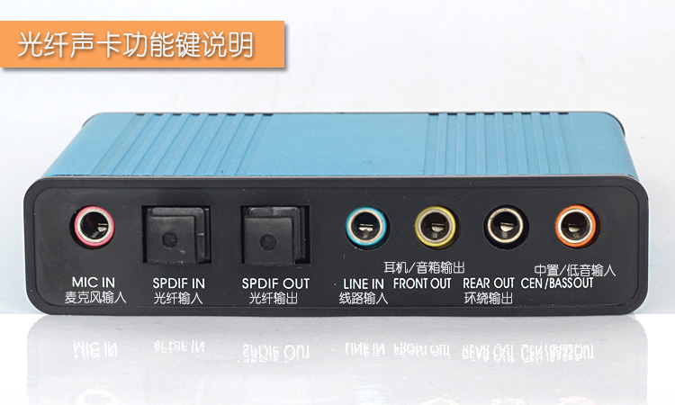 豪華高檔專業USB聲卡,支持專業5.1聲道輸出以及光纖SPDIF輸出,PC+聲卡+功放和5.1音箱.組建您的數字家庭影院.享受真正的AC-3或DTS環繞音效.或者直接連接5.1有源音箱。非常適合HTPC家庭影院及音質要求較高的朋友(如看電影/遊戲/K歌)使用,可插普通耳麥語音聊天以及網絡K歌等。