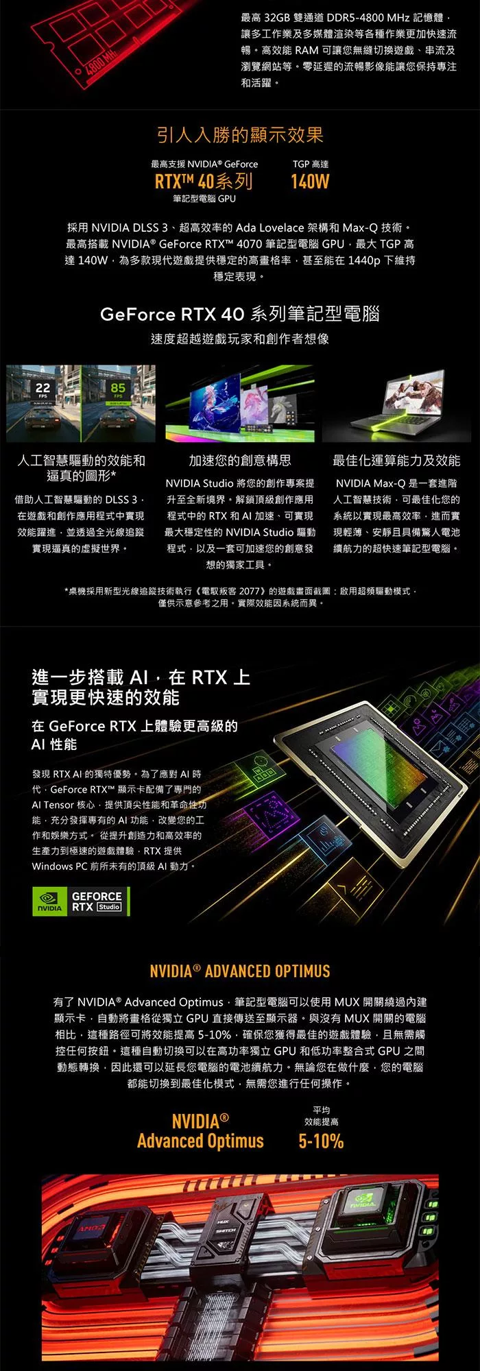 顯示晶片:NVIDIA GeForce RTX 4050 Laptop GPU 6GB GDDR6(194 AI TOPs)(具備MUX獨顯直連)