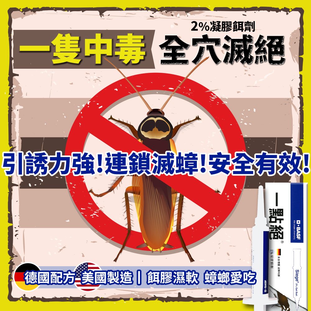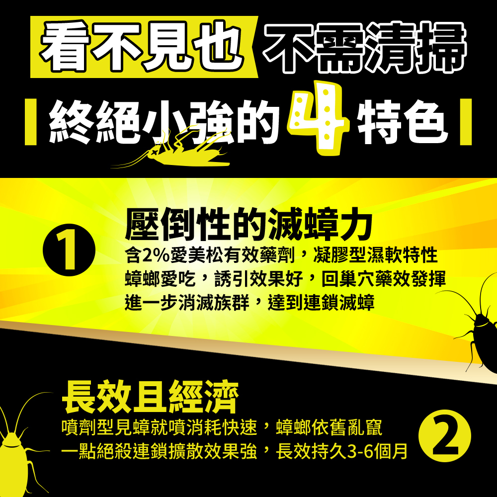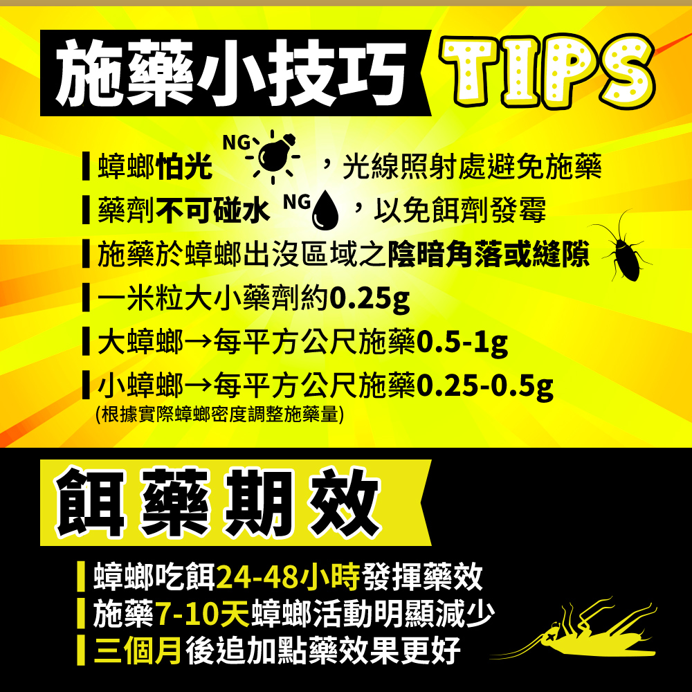 ●蟑螂取食24-48小時發揮藥效,藉其群居與食屍特性可進一步消滅族群