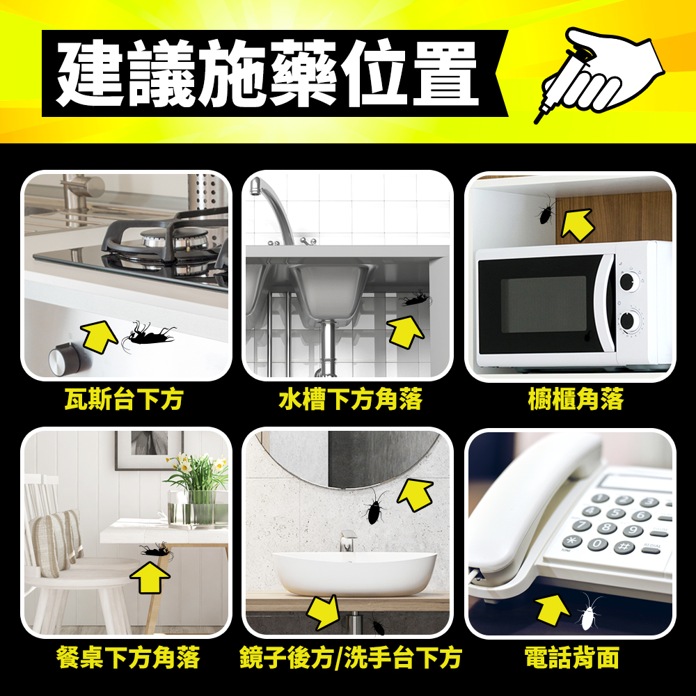 ●蟑螂伯光,凡光線照射之處皆應避免施藥。