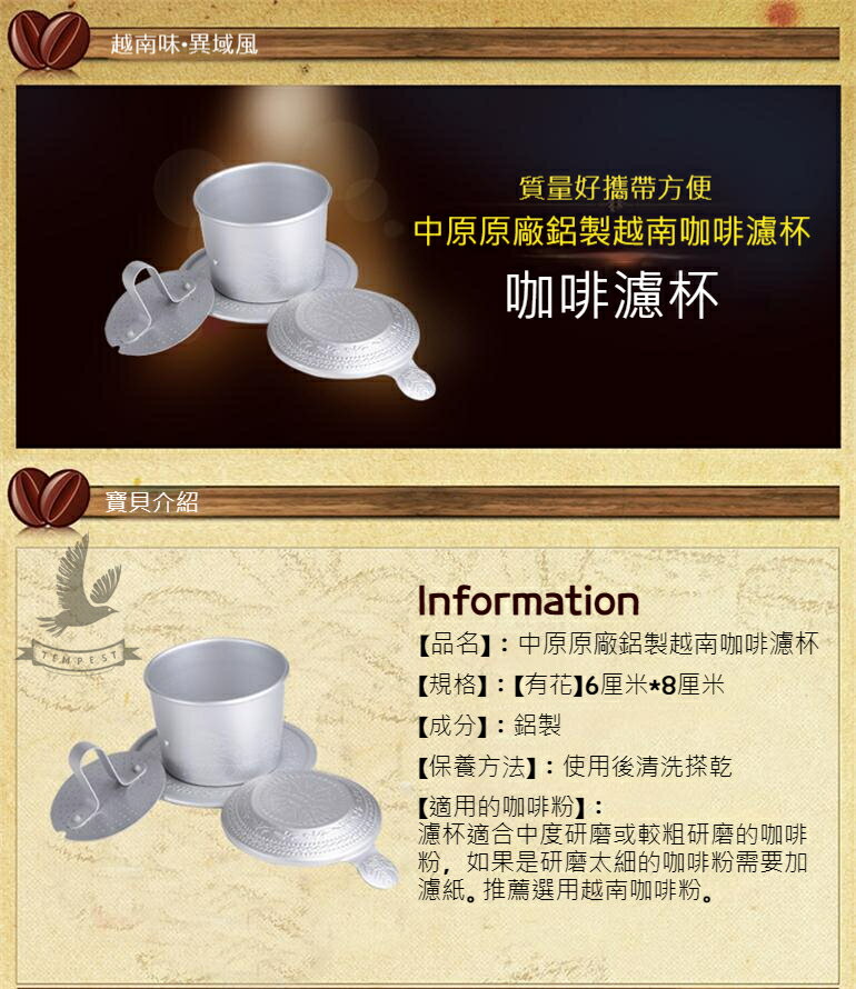 🔍 經典風格:Vietnam 咖啡濾設計經典,保留越南傳統的濾掛式風格,為您帶來原汁原味的越南咖啡體驗。