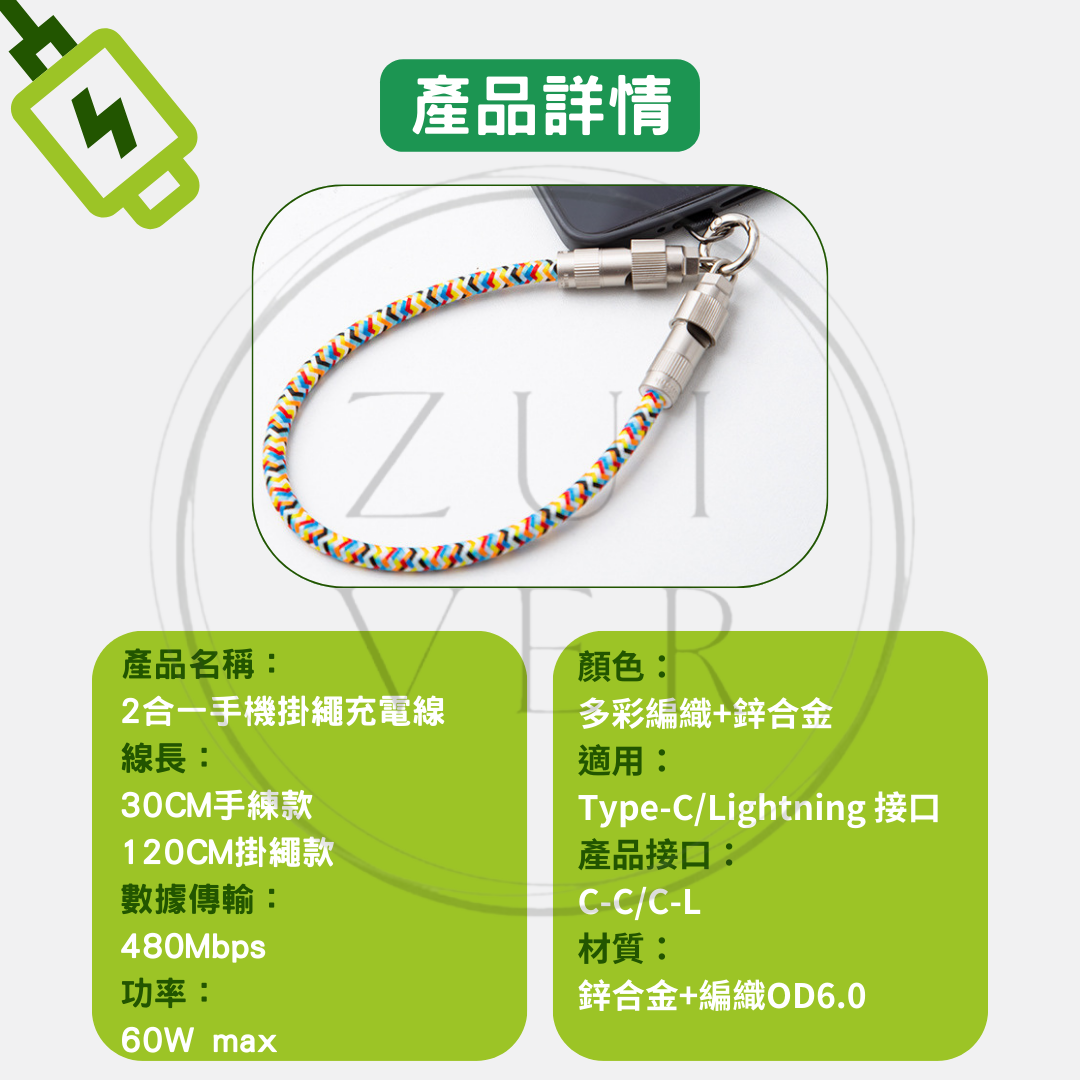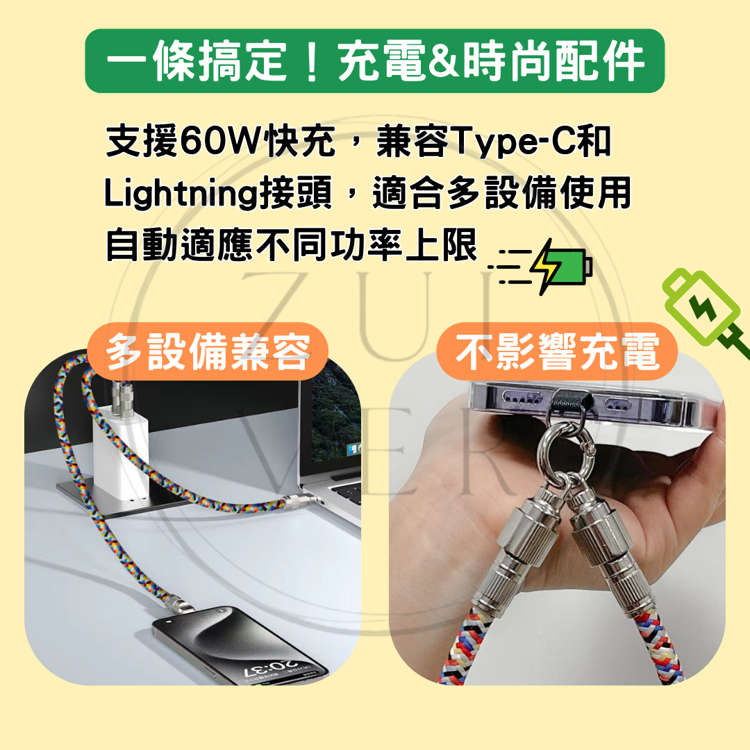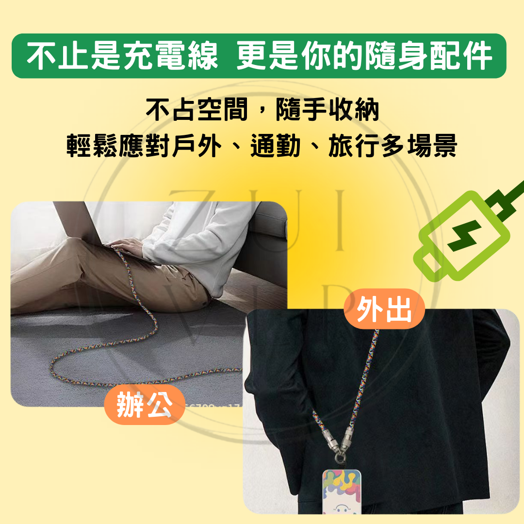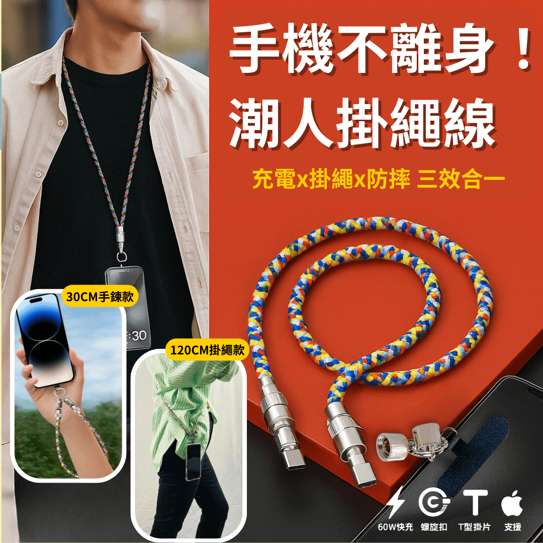 🔥二合一掛繩充電線|60W快充 耐用防拉扯設計|多功能外出神器 產品特色: 二合一設計:整合掛繩與充電線,出門只需一條線即可應對充電與穿戴需求。 支援快充:最高60W快充(Type-C),適用iOS與安卓設備,快速充電節省時間。 加粗編織線材:耐用且抗拉扯,適合長期使用,編織設計防止纏繞打結。 時尚與功能兼備:多種款式選擇,適合外出、旅行、運動,兼具實用性與造型感。 高效傳輸:480Mbps高速傳輸數據,同時滿足充電與資料傳輸需求。 鎖頭簡易切換:鋅合金鎖頭設計,操作簡單,隨時切換充電與穿戴狀態。 Q1: 我經常外出旅行,這條掛繩充電線可以滿足我的需求嗎? A1: 當然可以!這款掛繩充電線設計專為旅行與外出人士打造,不僅讓充電線隨身攜帶,還能用作手機掛繩,讓您免去忘記攜帶充電器的煩惱,同時兼具快充與資料傳輸功能,是旅行的最佳伴侶。 Q2: 加粗編織線材真的不會打結嗎? A2: 是的!我們的編織線採用防纏繞設計,耐拉扯且不易打結,讓您不再為線材糾結煩惱,使用壽命也更長。 Q3: 支援哪些設備充電? A3: 此產品支援多種設備,包含Type-C到Type-C,以及Type-C到Lightning,無論您使用的是安卓還是iOS設備,都能完美適配,最高支持60W快充,快速滿電無壓力。 Q4: 使用鎖頭會不會影響充電? A4: 不會!鎖頭設計安全穩固,不會鬆脫或影響充電與傳輸,使用起來簡單方便且安心。 核心價值: 解決攜帶問題: 整合手機掛繩與充電線功能,讓使用者外出無需額外攜帶充電線,減少遺失與忘記攜帶的困擾。 增強便利性: 鎖頭設計簡單好用,快速切換充電或穿戴模式,適合快節奏生活。 耐用性: 採用鋅合金與加粗編織材質,抗拉扯、耐用不易打結。 偏愛功能性與時尚設計的年輕族群。 經常移動的學生、上班族、旅行愛好者,或需要多功能裝備的戶外運動愛好者。 解決: 外出時常遺忘攜帶充電設備,或需要多種裝備(充電線、手機掛繩),過於繁瑣。
