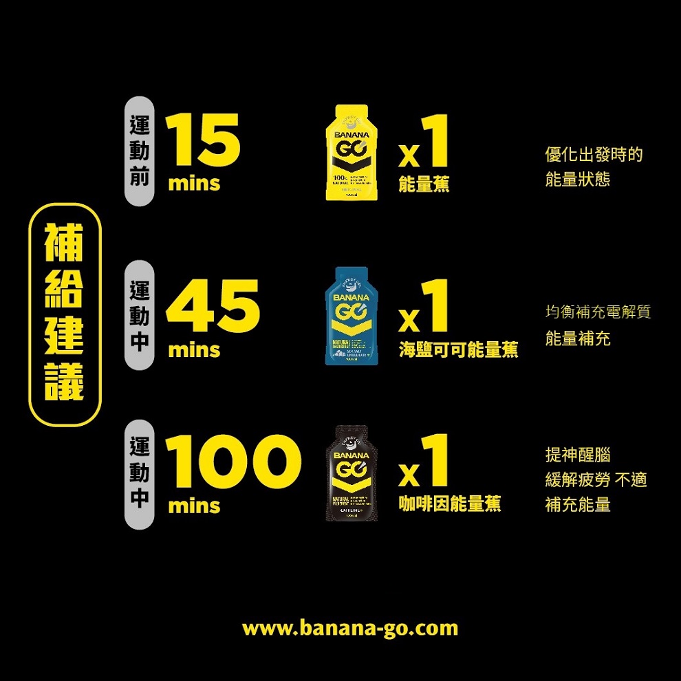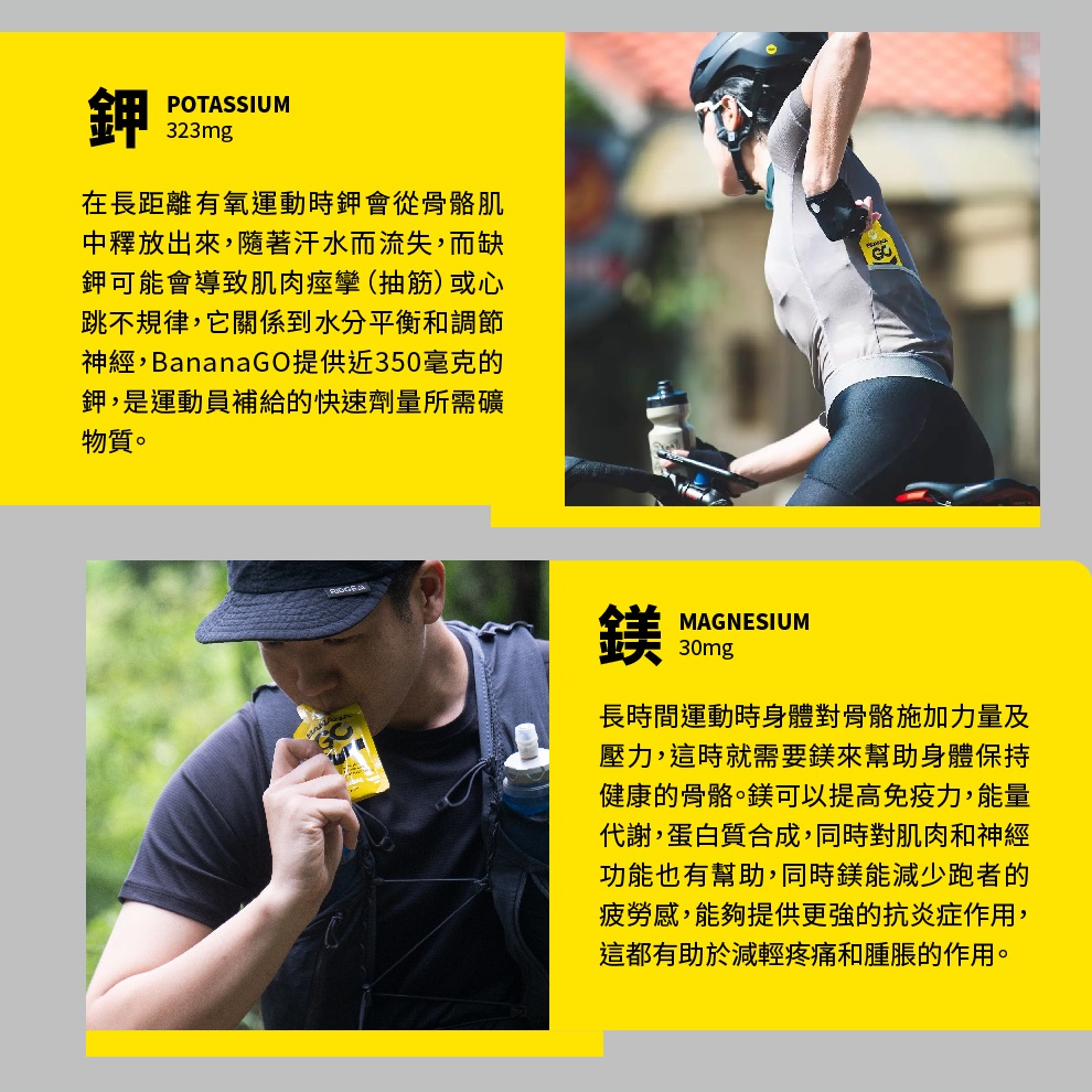 * 每份32g Banana GO能量膠包含等同於一根新鮮香蕉的完整熱量與營養素+豐富礦物質。