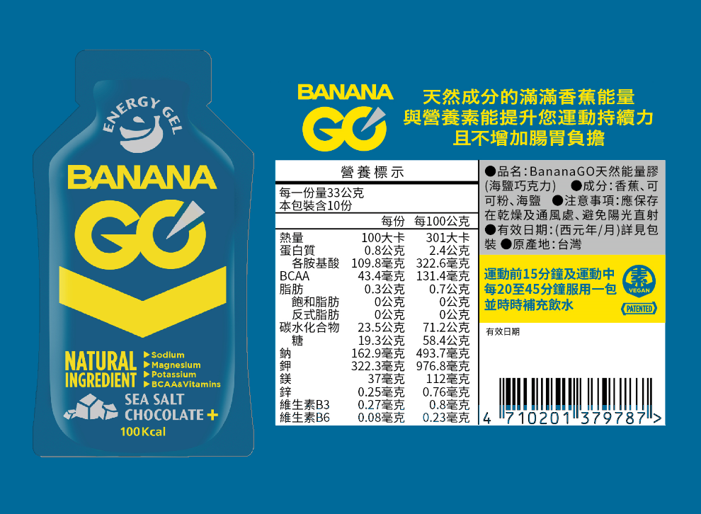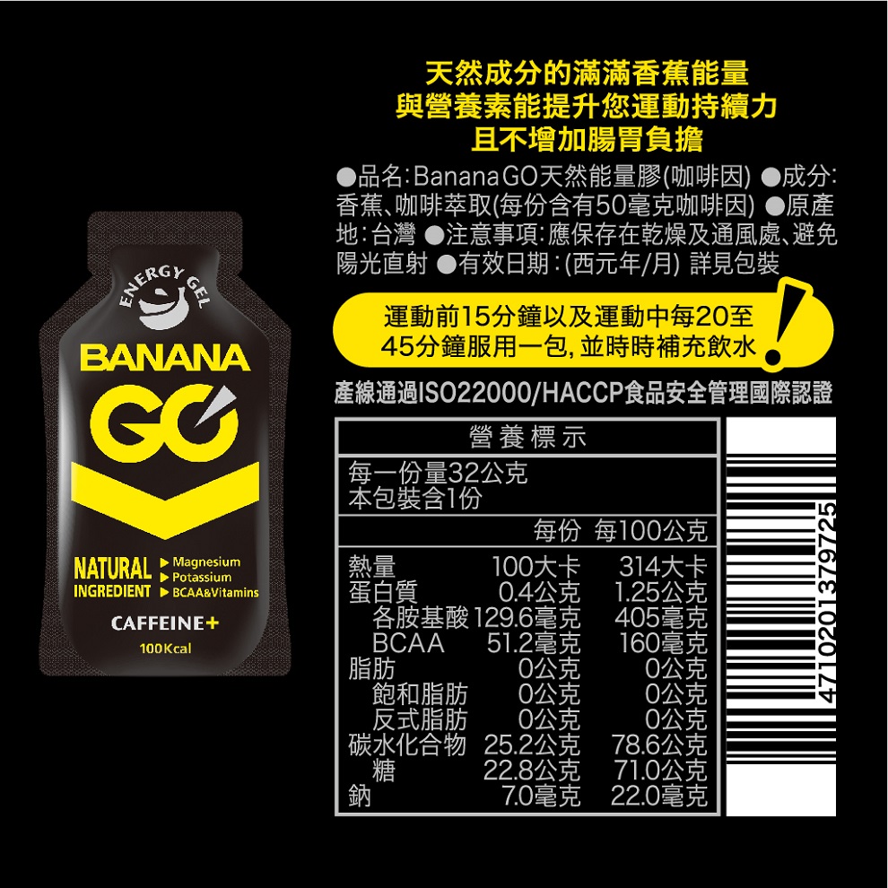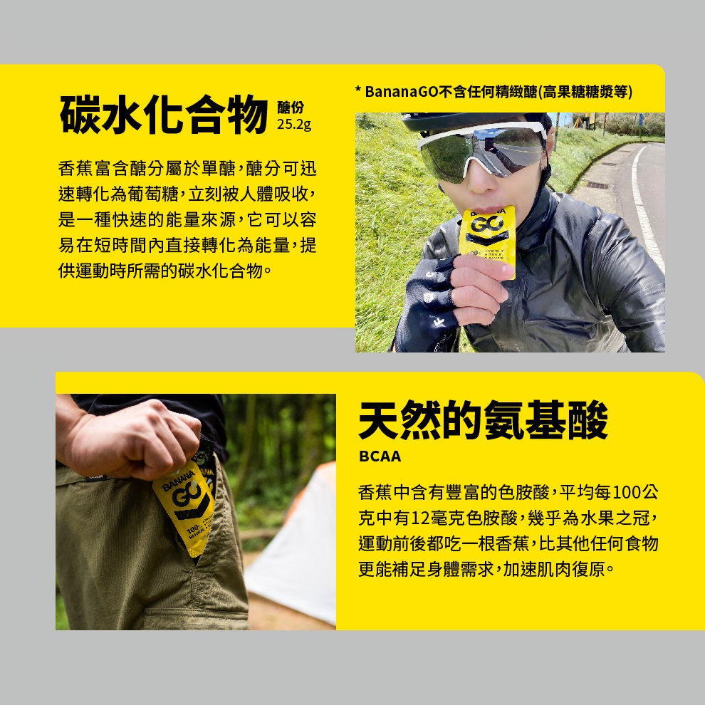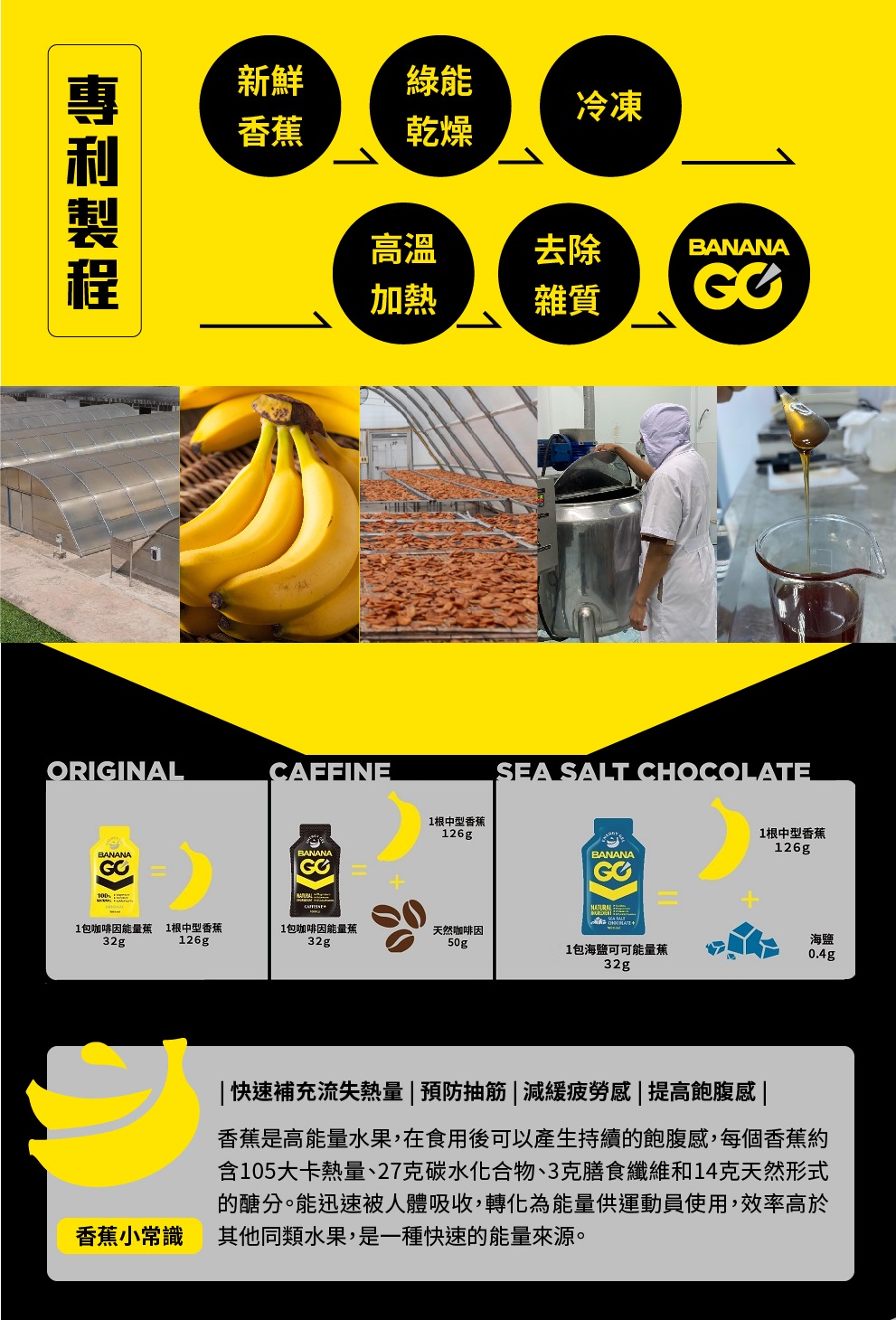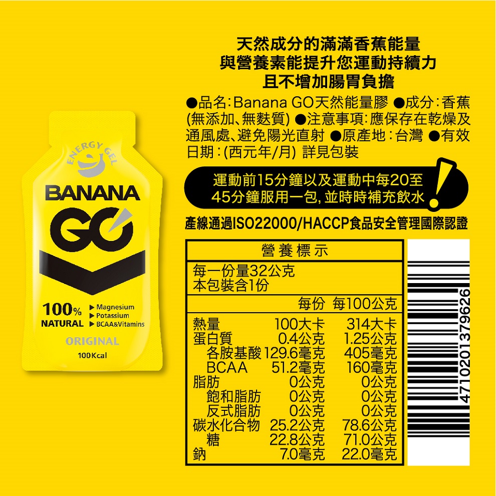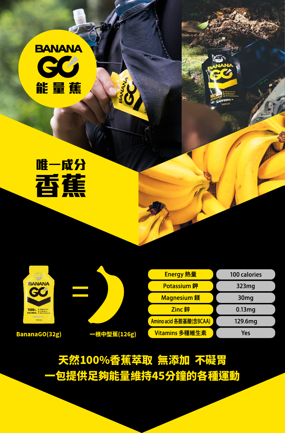 每份Banana GO能量膠含有一根新鮮香蕉的完整熱量和大部分的營養素!