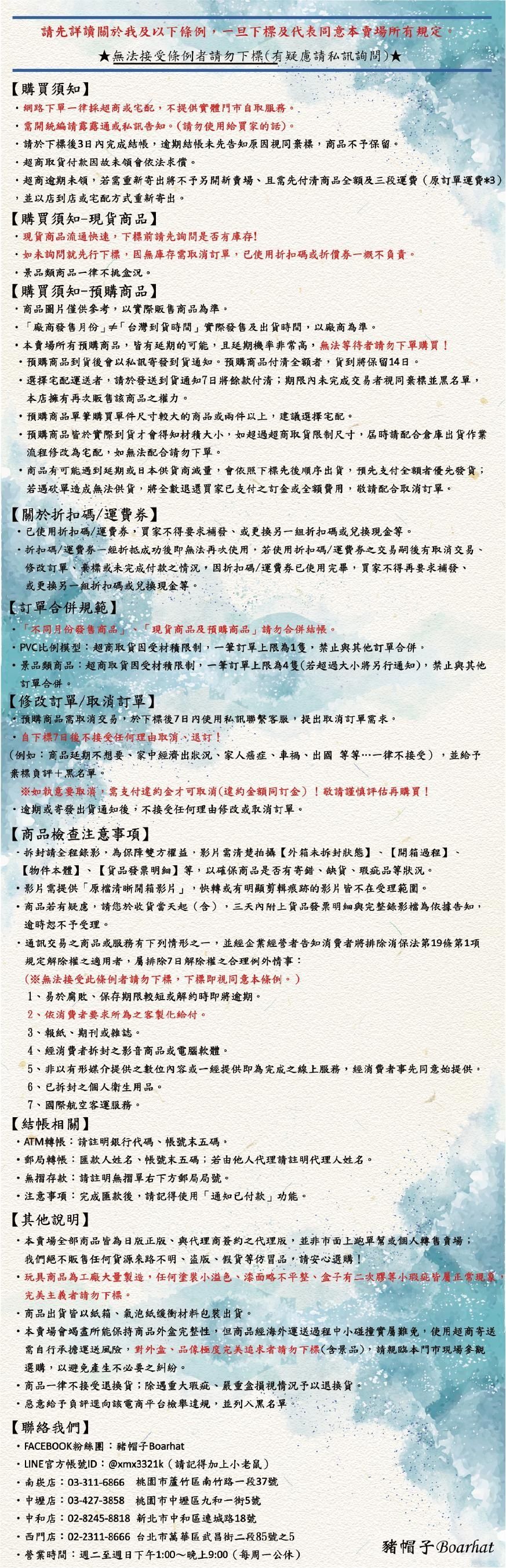 ❤ 預購商品需取消交易,於下標後7日內聯繫小編,逾期不接受任何理由取消、退訂(例:延期不想要、經濟困難、癌症、車禍、出國等等),且需支付違約金(同訂金)才可取消!
