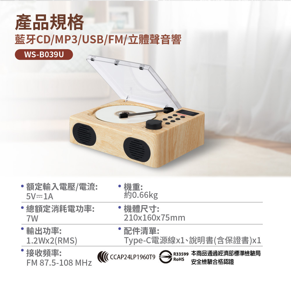 WONDER 旺德 藍牙CD/MP3/USB/FM立體聲音響 WS-B039U