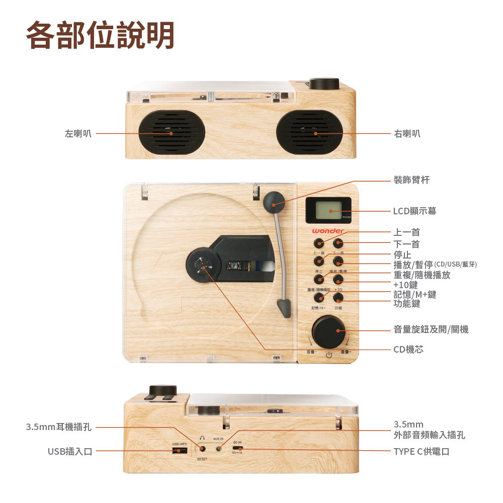 可播放藍牙/CD/MP3/USB/外部音源/FM收音機