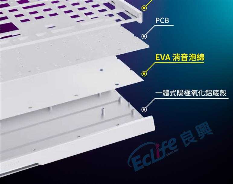 ●雙層降噪材質(矽膠墊 & EVA泡棉),搭配金屬定位版,昇華打字手感