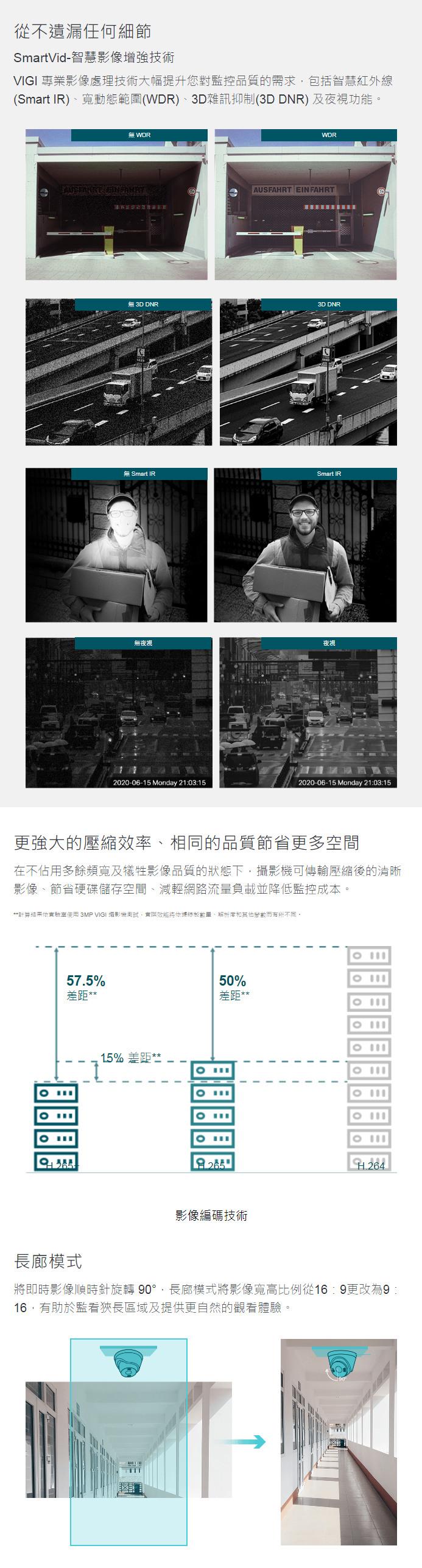 - 智慧影像增強技術:VIGI 的專業技術處理影像時,極大地提升了其品質,這對於您的監控至關重要,包括智能紅外線(Smart IR)、寬動態範圍(WDR)、3D DNR 和夜視。