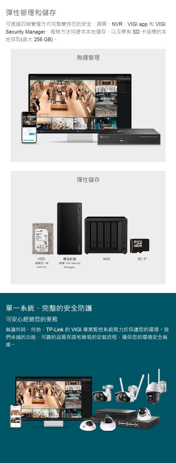 - 靈活管理:透過四種管理方法完全的監控您的安全性:Web UI、NVR UI、VIGI App 和 VIGI Security Manager。每種方法均提供本地儲存,同時還支援使用搭載 SD 卡槽的機身來儲存(最大可擴充至 256GB)。