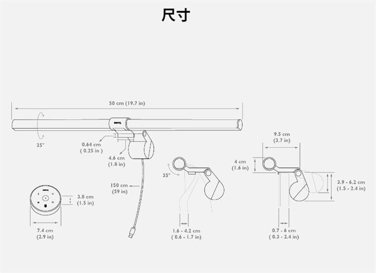 燈頭 : 50 x 9.5 x 9.7 / 控制器 : 7.4 x 7.4 x 3.8