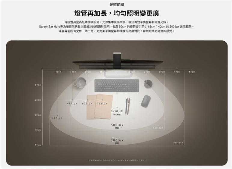 ●非對稱光學設計,螢幕0反光;只照桌面不照螢幕