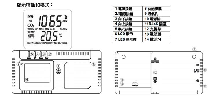 □ V內置日誌存儲功能:可記錄 48 個過去 24 小時內的量測的 CO2 和溫度值,每 30 分鐘一個記錄。