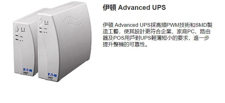 Eaton Advanced UPS 1000VA 採用了高頻PWM技術和SMD製造工藝,使其設計更符合企業/家庭PC、路由器及POS用戶對UPS的輕、薄、短、小,無干擾的要求,進一步提升了整機的可靠性。