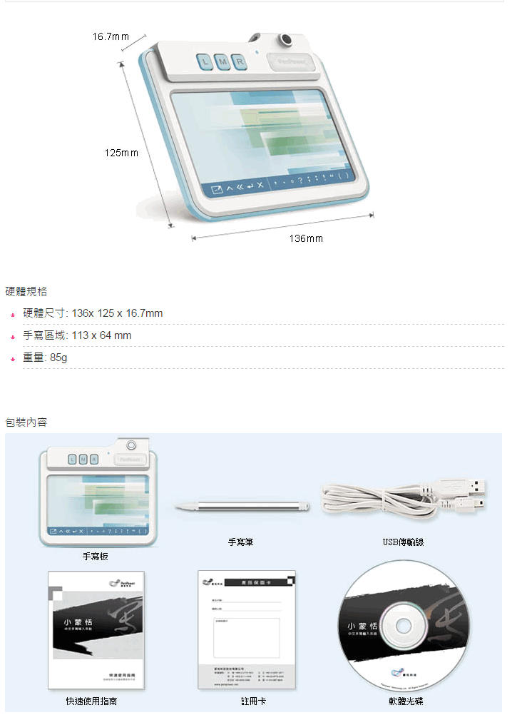 【Max小蒙恬】採用5吋感壓面板,提供寬廣的書寫區域,搭配時尚金屬質感專用筆,符合人體工學的設計,讓您書寫更加得心應手。機身輕薄易攜,外觀設計清新亮眼,面板設有快捷標點符號工具列,手寫時可快速點選輸入,還可將常用的鍵盤功能設定於面板上方按鍵,不需在使用時忙於切換,大幅提升手寫輸入效率!【Max小蒙恬】除了具備貼心的快捷按鍵設計,還擁有豐富加值的功能,系統能在書寫時學習個人書寫筆跡及自動修正辨識結果,更提供聯想字/詞庫、特殊符號表、國/粵語發音等輔助功能,透過精準辨識核心技術,能精準識別潦草的連筆字、繁簡體中文、香港字、英文字母、平/片假名、數字與標點符號,讓手寫輸入快速又精準。