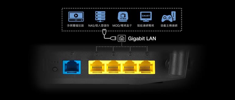 RT-AC1500G PLUS 配備四個 Gigabit LAN 連接埠,可同時連線智慧型電視、遊戲主機、機上盒、媒體播放器、NAS 儲存裝置等產品現在都能擁有專用連接埠,並且完全支援中華電信MOD,