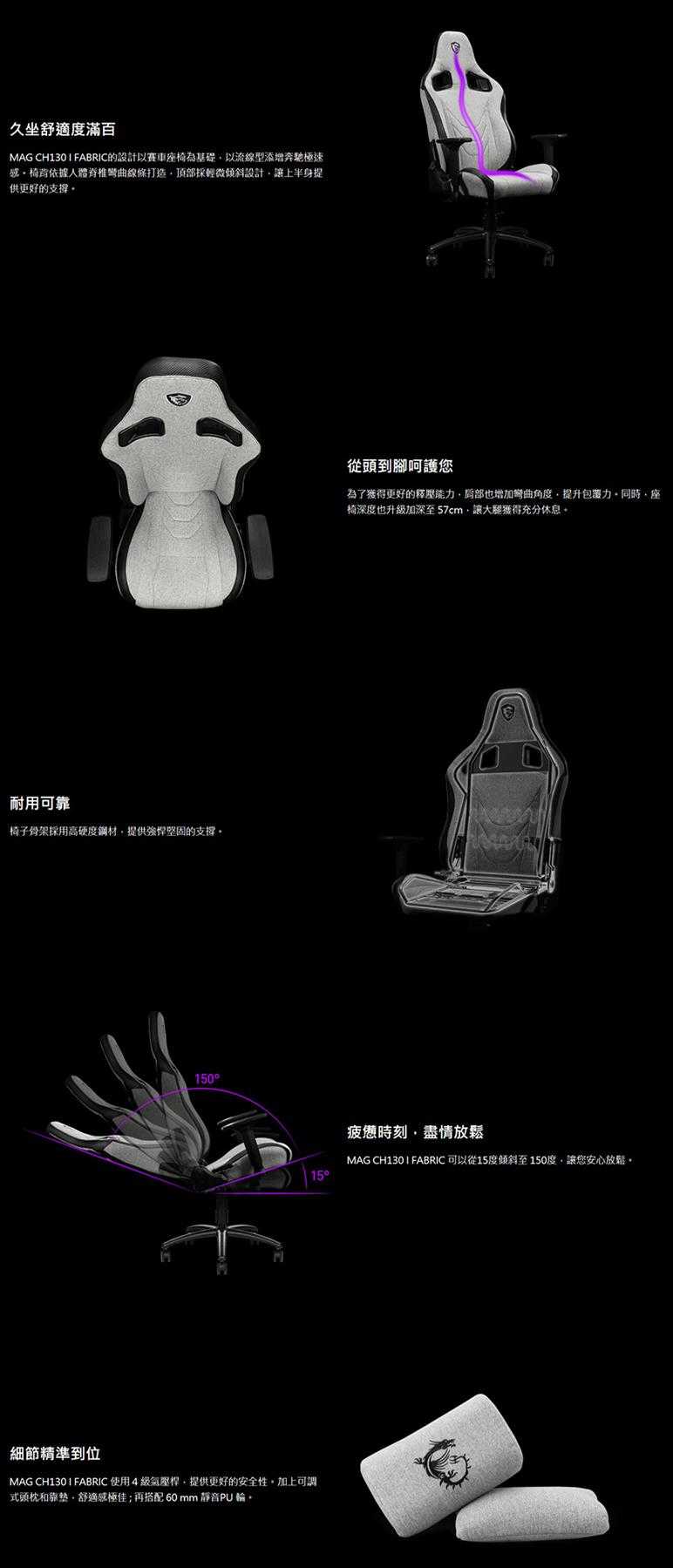 ● 疲憊時刻,盡情放鬆:MAG CH130 I FABRIC 可以從15度傾斜至 150度,讓您安心放鬆。