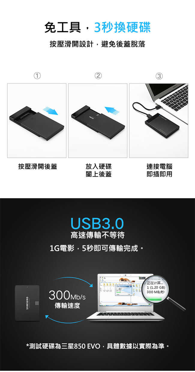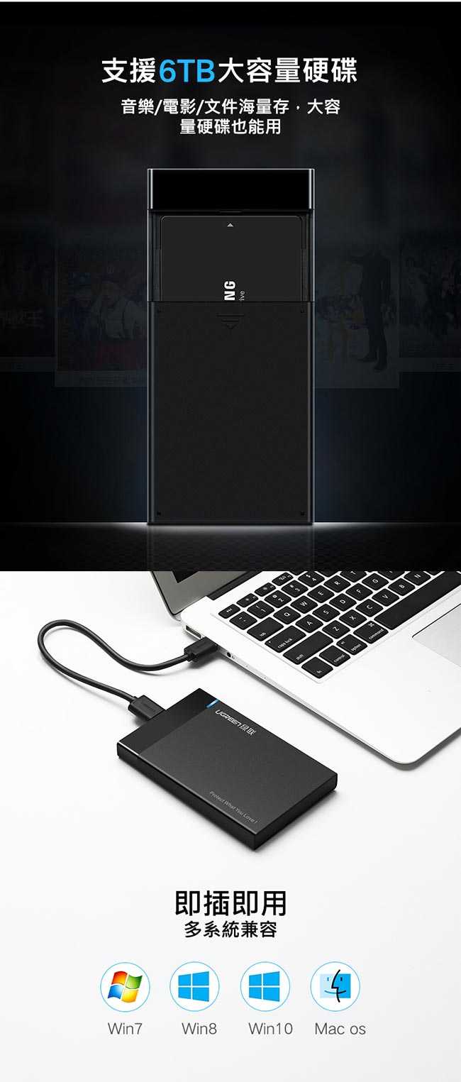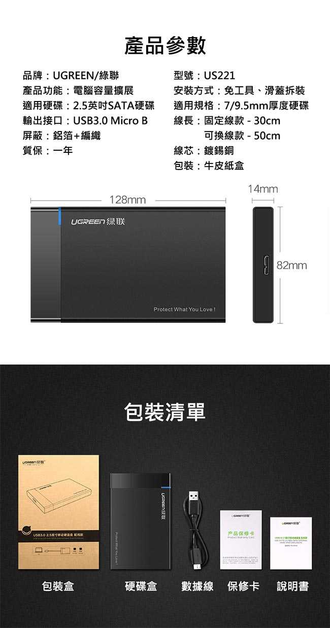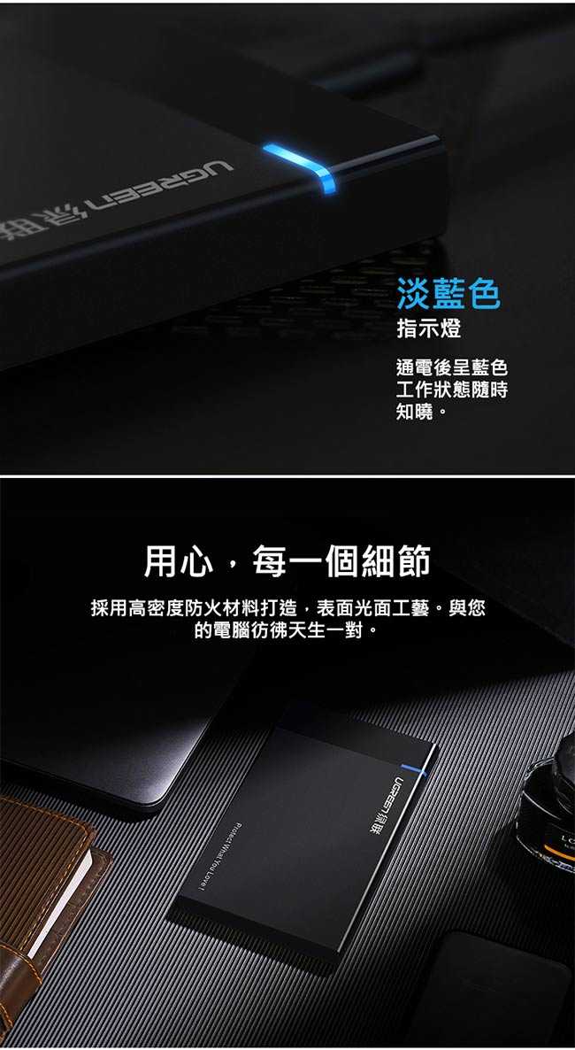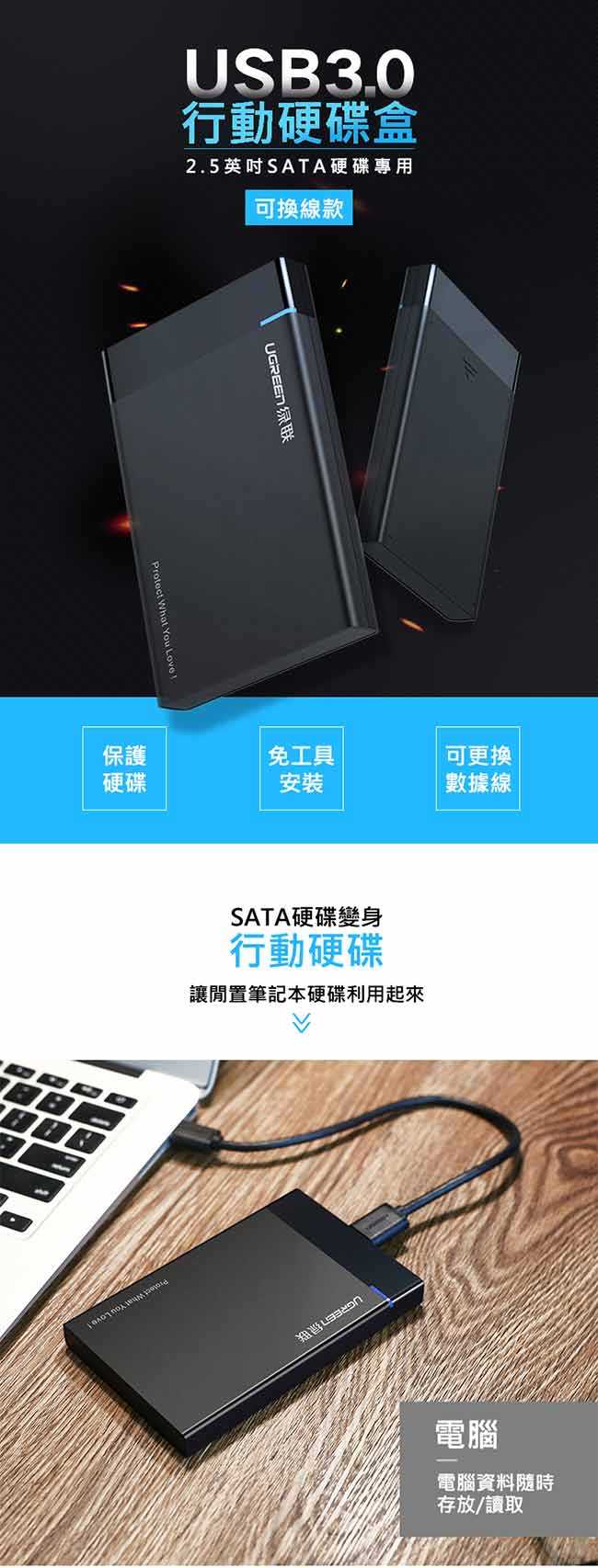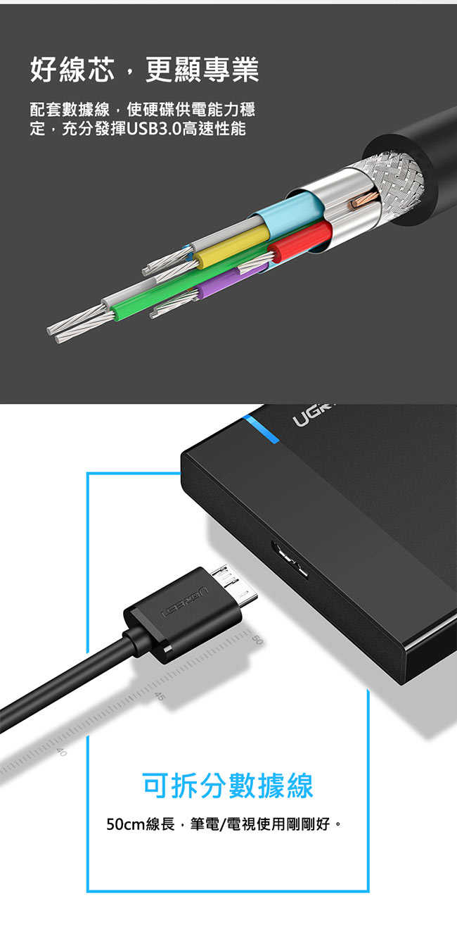UGREEN 綠聯 2.5吋USB3.0隨身硬碟外接盒 免工具安裝 可換線版