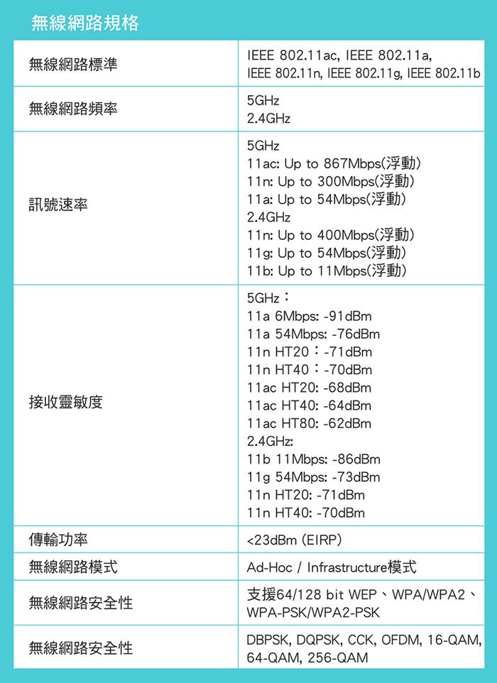 | 無線網路模式 | Ad-Hoc / Infrastructure模式 |