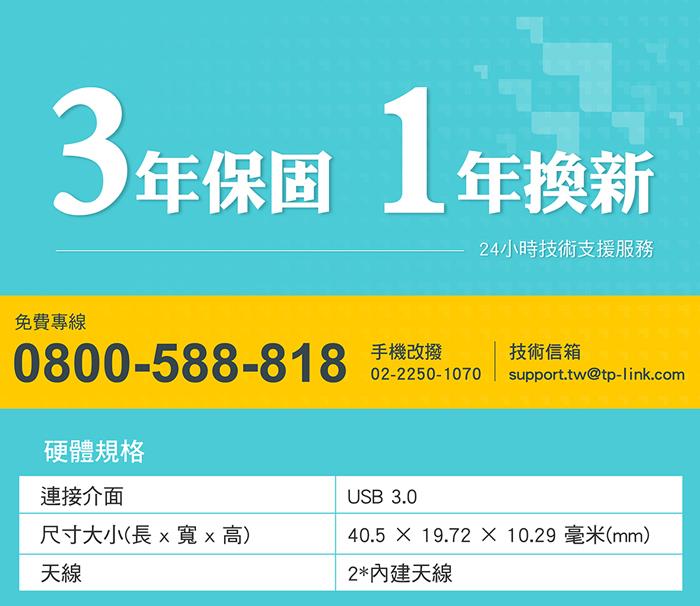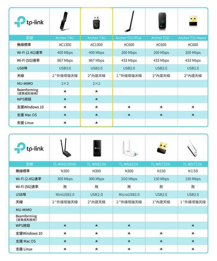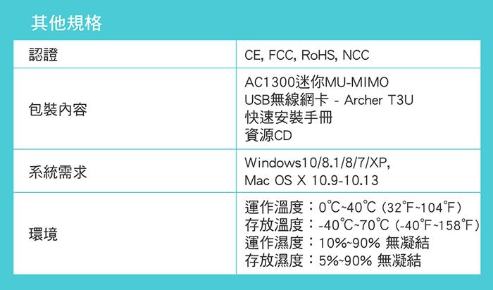 | 包裝內容 | AC1300迷你MU-MIMO USB無線網卡 - Archer T3U |
