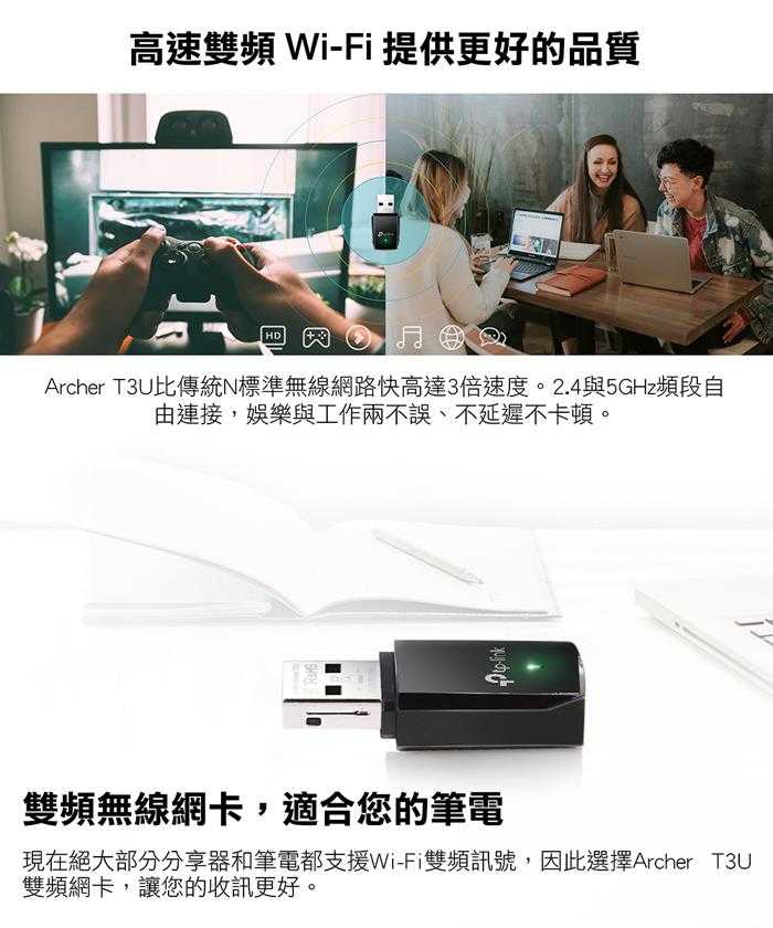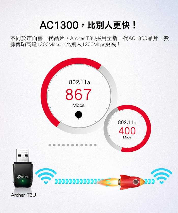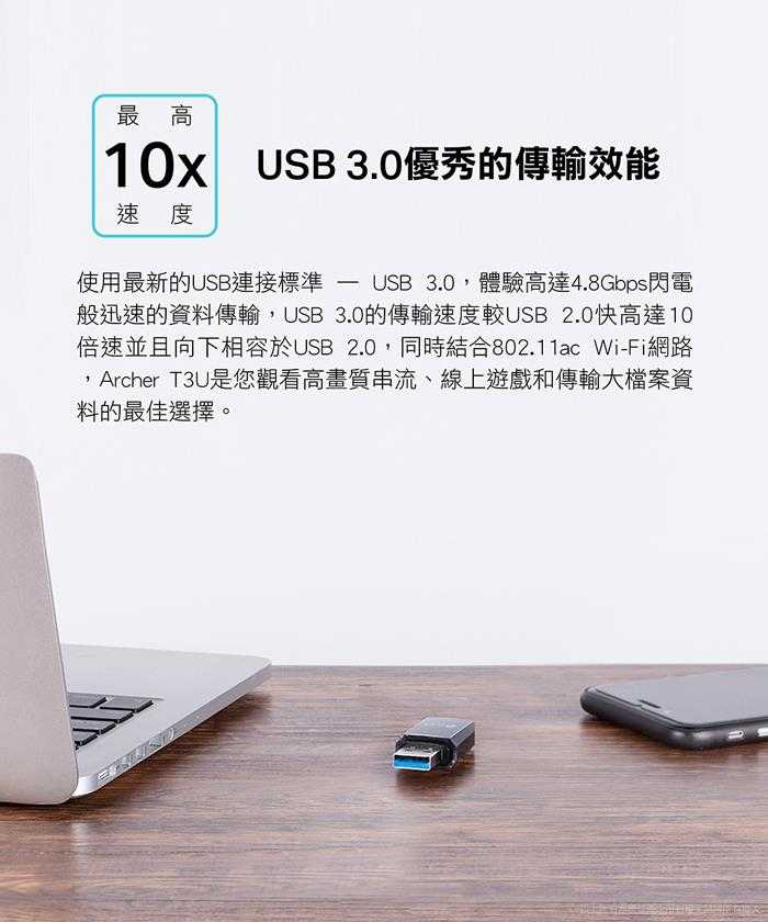 使用最新的USB連接標準 — USB 3.0,體驗高達4.8Gbps閃電般迅速的資料傳輸,USB 3.0的傳輸速度較USB 2.0快高達10倍速並且向下相容於USB 2.0,同時結合802.11ac Wi-Fi網路,Archer T3U是您觀看高畫質串流、線上遊戲和傳輸大檔案資料的最佳選擇。