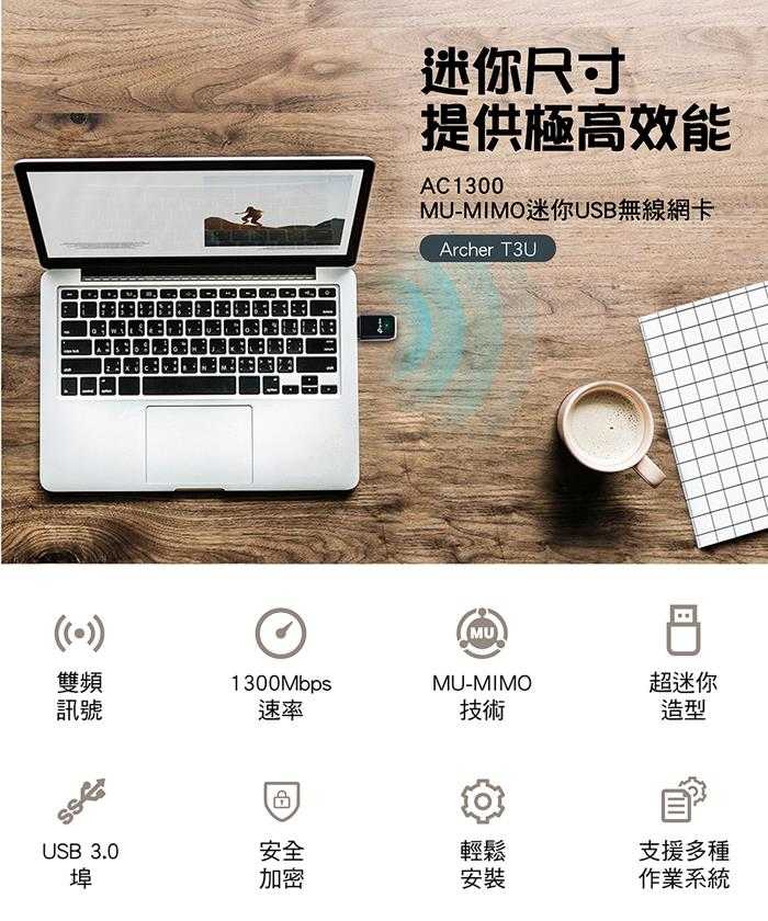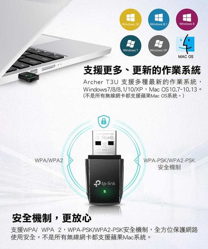 Archer T3U比一般USB無線網卡小巧,能相容於所有USB連接埠,也容易隨身攜帶,適合大部分使用環境。