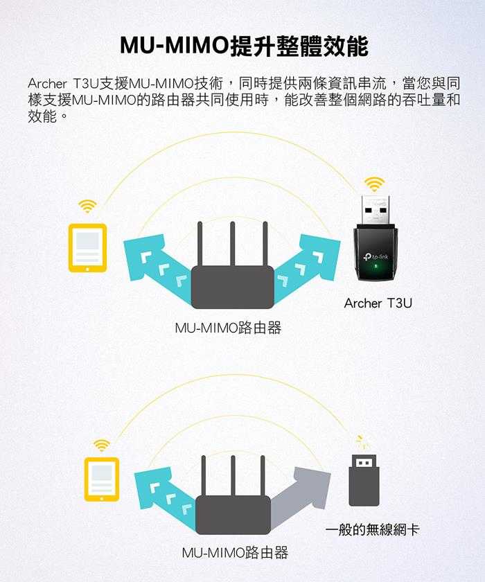 Archer T3U支援MU-MIMO技術,同時提供兩條資訊串流,當您與同樣支援MU-MIMO的路由器共同使用時,能改善整個網路的吞吐量和效能。
