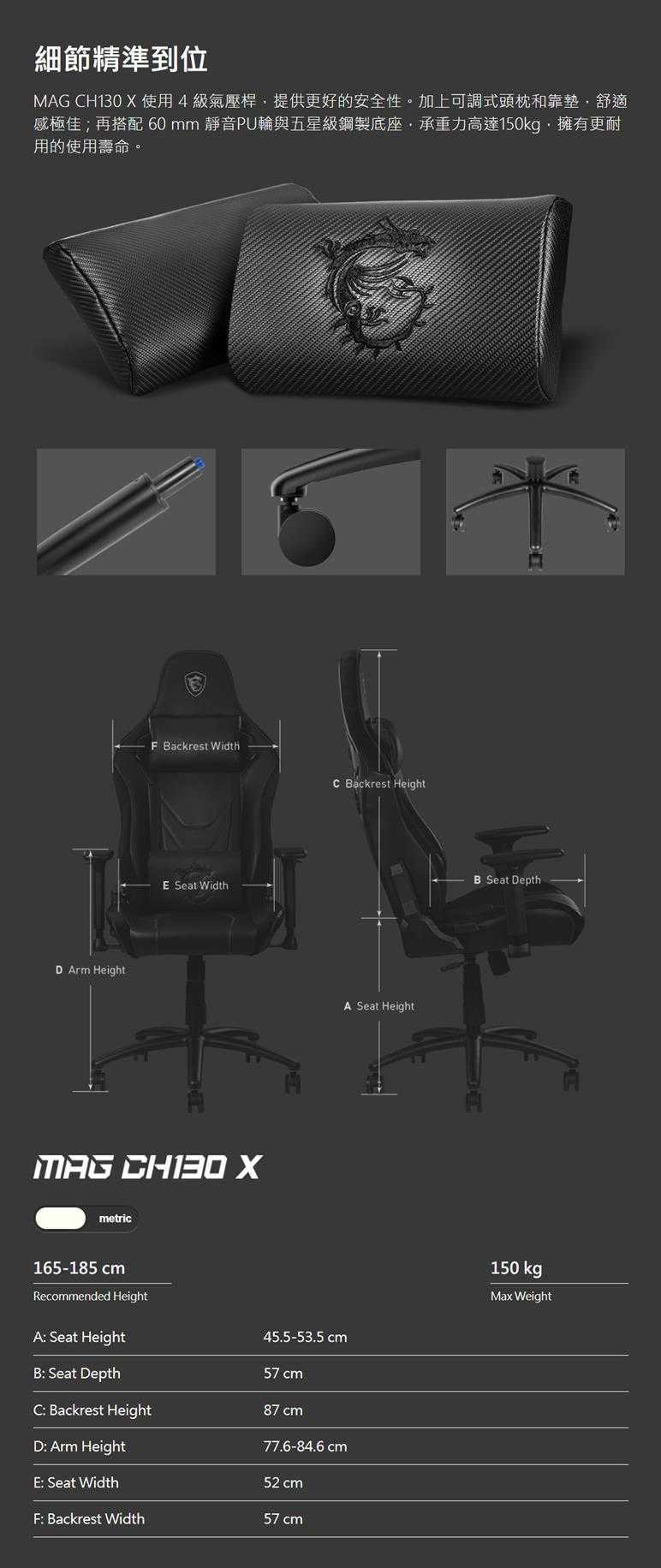 ● 細節精準到位:MAG CH130X 使用 4 級氣壓桿,提供更好的安全性。加上可調式頭枕和靠墊,舒適感極佳 ; 再搭配 60 mm 靜音PU 輪與五星級鋼製底座,承重力高達150kg,擁有更耐用的使用壽命。