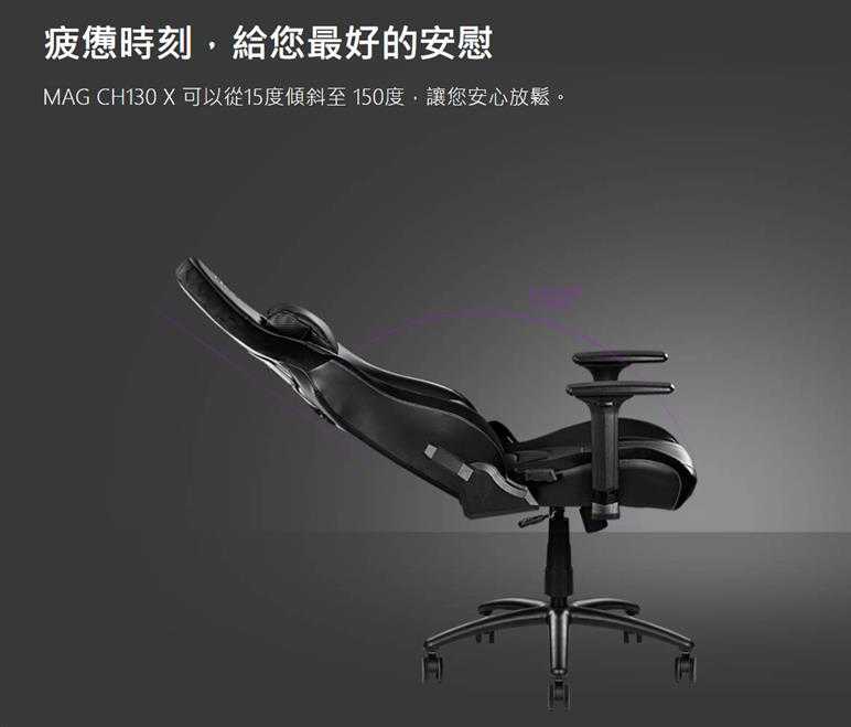 ● 疲憊時刻給您最好的安慰:MAG CH130X 可以從15度傾斜至150度,讓您安心放鬆。