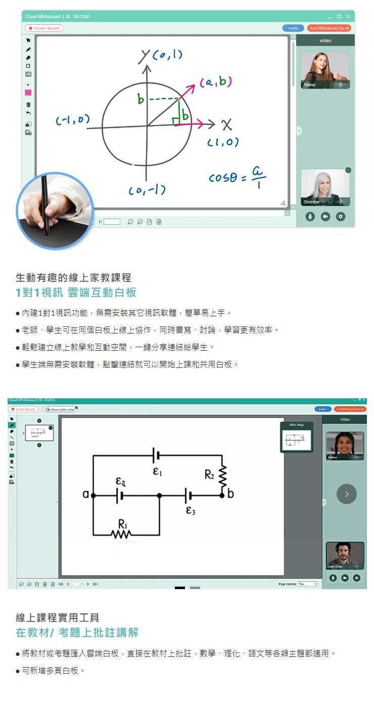 ●將教材或考題匯入雲端白板,直接在教材上批註,數學、理化、語文等各類主題都適用