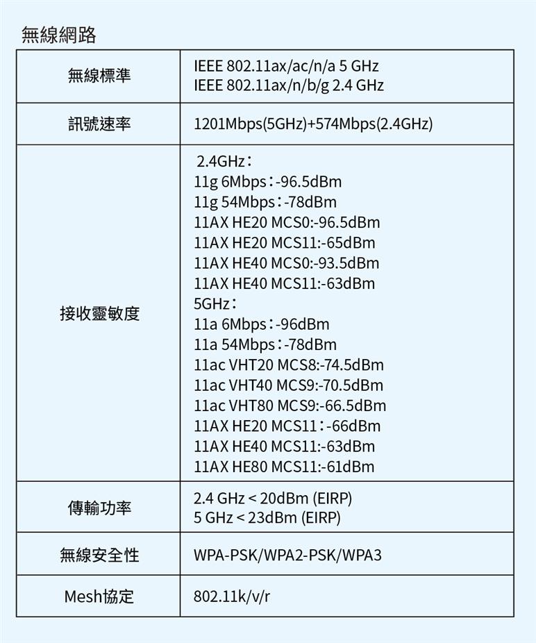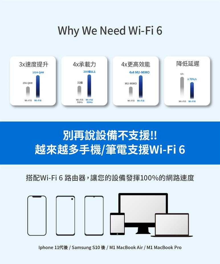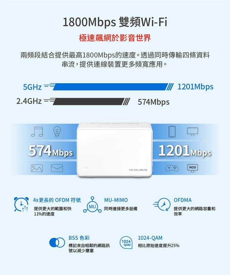 ● 雙頻WiFi 6 速度高達 1800 Mbps