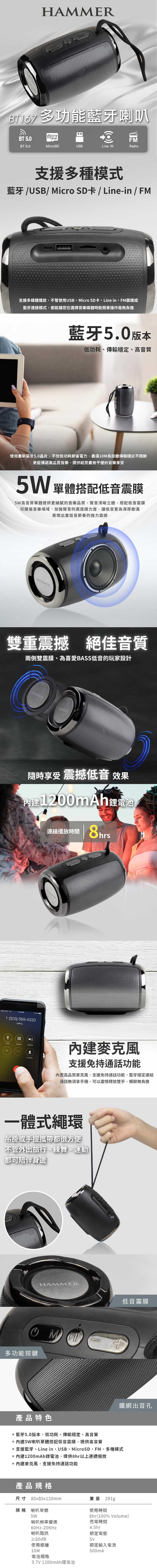 ● 支援藍牙、Line in、USB、MicroSD、FM,多種模式