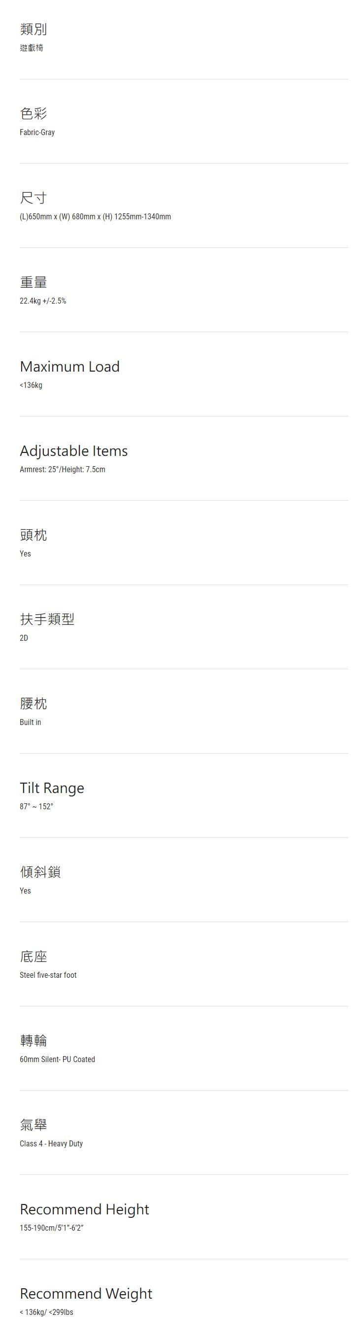 Adjustable Items:Armrest: 25°/Height: 7.5cm