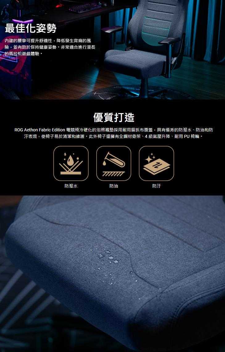 Premium ROG Aethon Gaming Chair Fabric Edition 電競椅採用全鋼材骨架、雙倍密度座墊、含2D軟墊扶手,並內建腰靠以提供最佳化的舒適性
