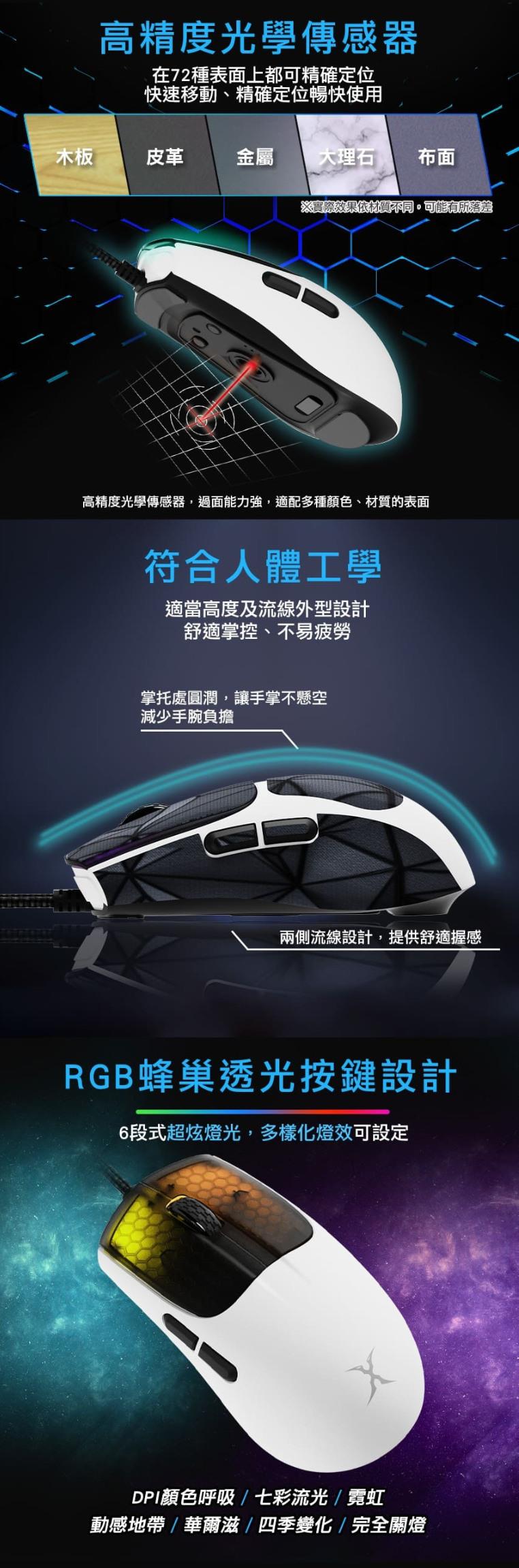 ●半透明蜂巢紋按鍵與六段可條多彩光效